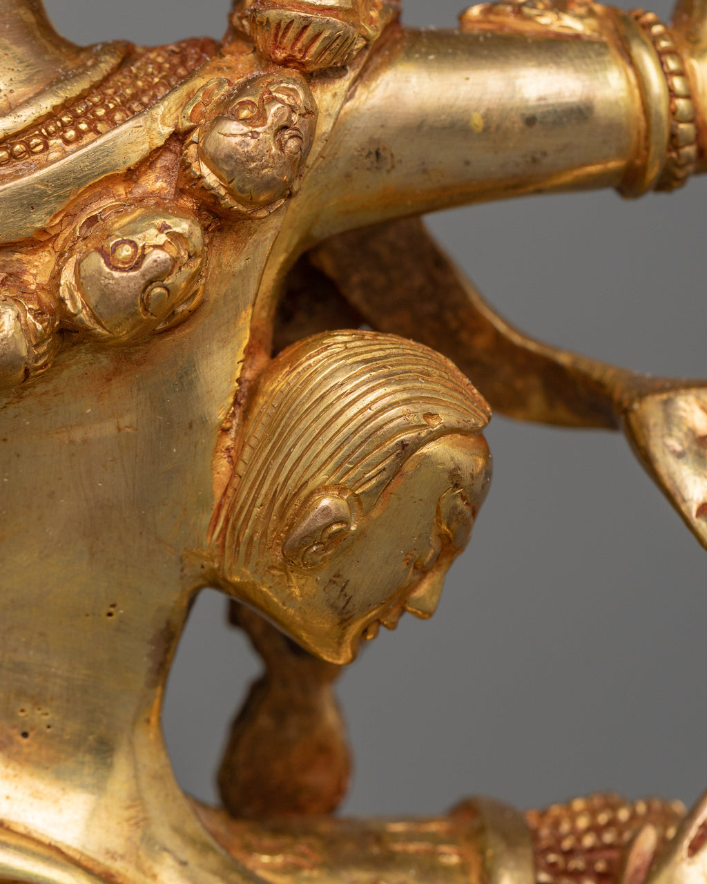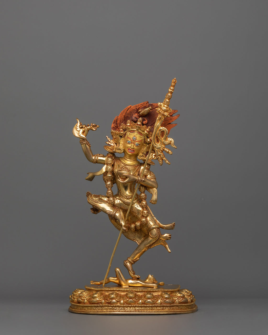 The Dorje Phagmo "Vajravarahi" Sculpture, standing at a height of 14.8 inches (37.5 cm) with a base width of 9.3 inches (23.5 cm), is a representation of this powerful deity. Crafted with a copper body, the statue is adorned with 24K gold gilding, further enhanced by intricate gold and acrylic paintings. This blend of materials adds a divine radiance to the statue, capturing the essence of Vajravarahi’s wisdom and transformative energy.