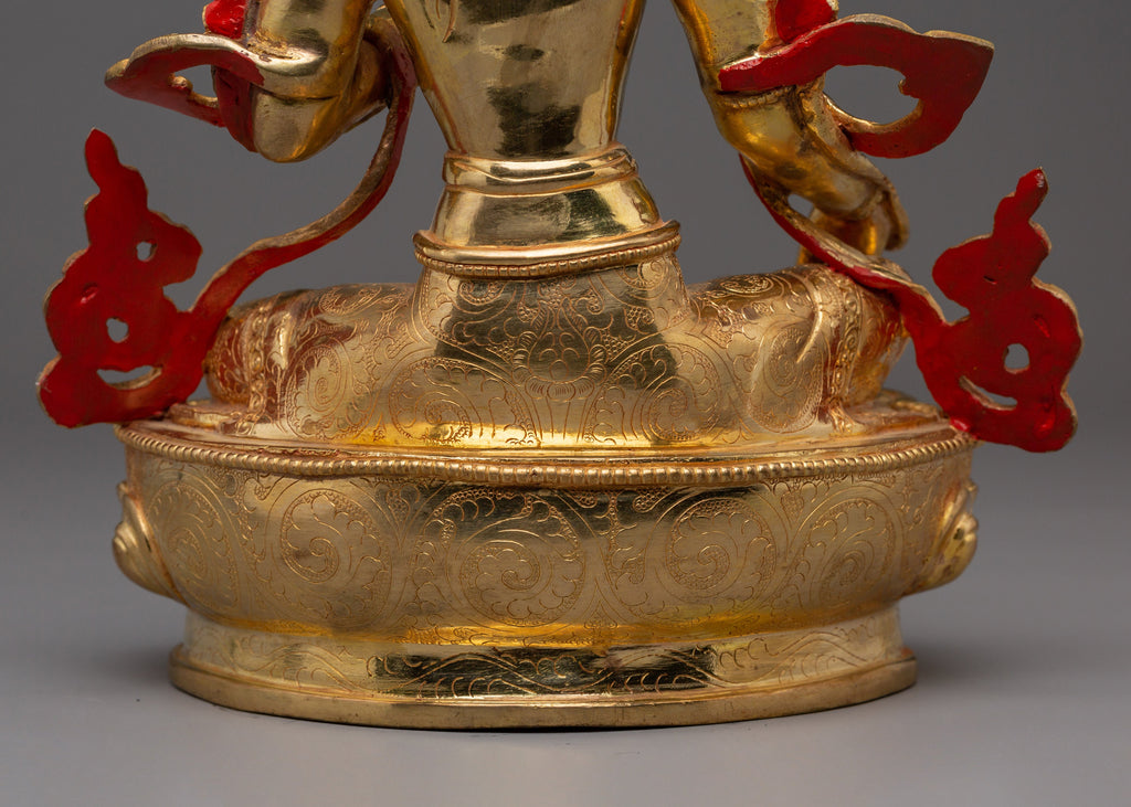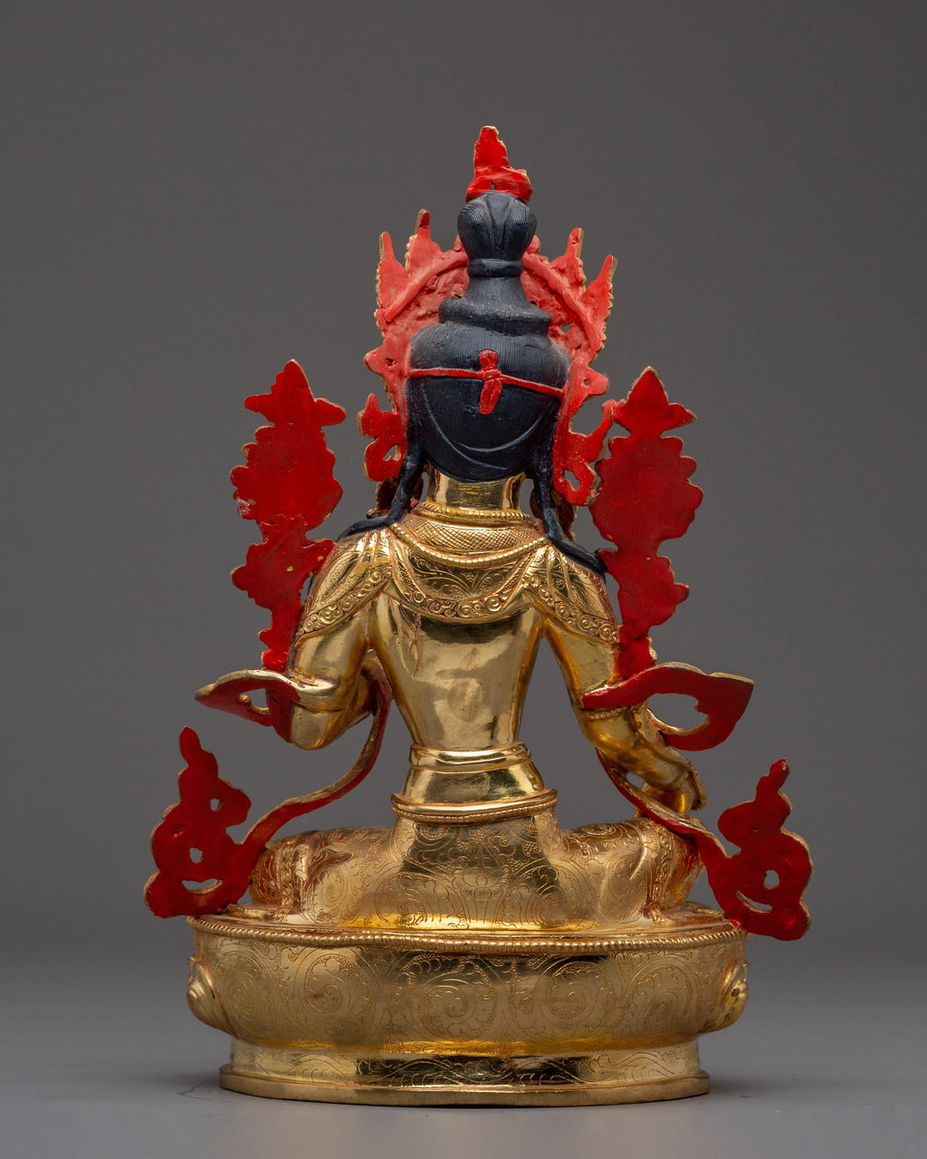 Divine Goddess Green Tara Statue is masterfully crafted with a copper body and adorned with 24K gold gilding, intricate gold and acrylic paintings, and inlaid gemstones, radiating divine beauty and spiritual significance. Measuring 13”/33cm in height and 9.4”/24cm at the base, this sacred piece weighs 3.21 kg, making it a perfect centerpiece for any personal shrine or meditation space.