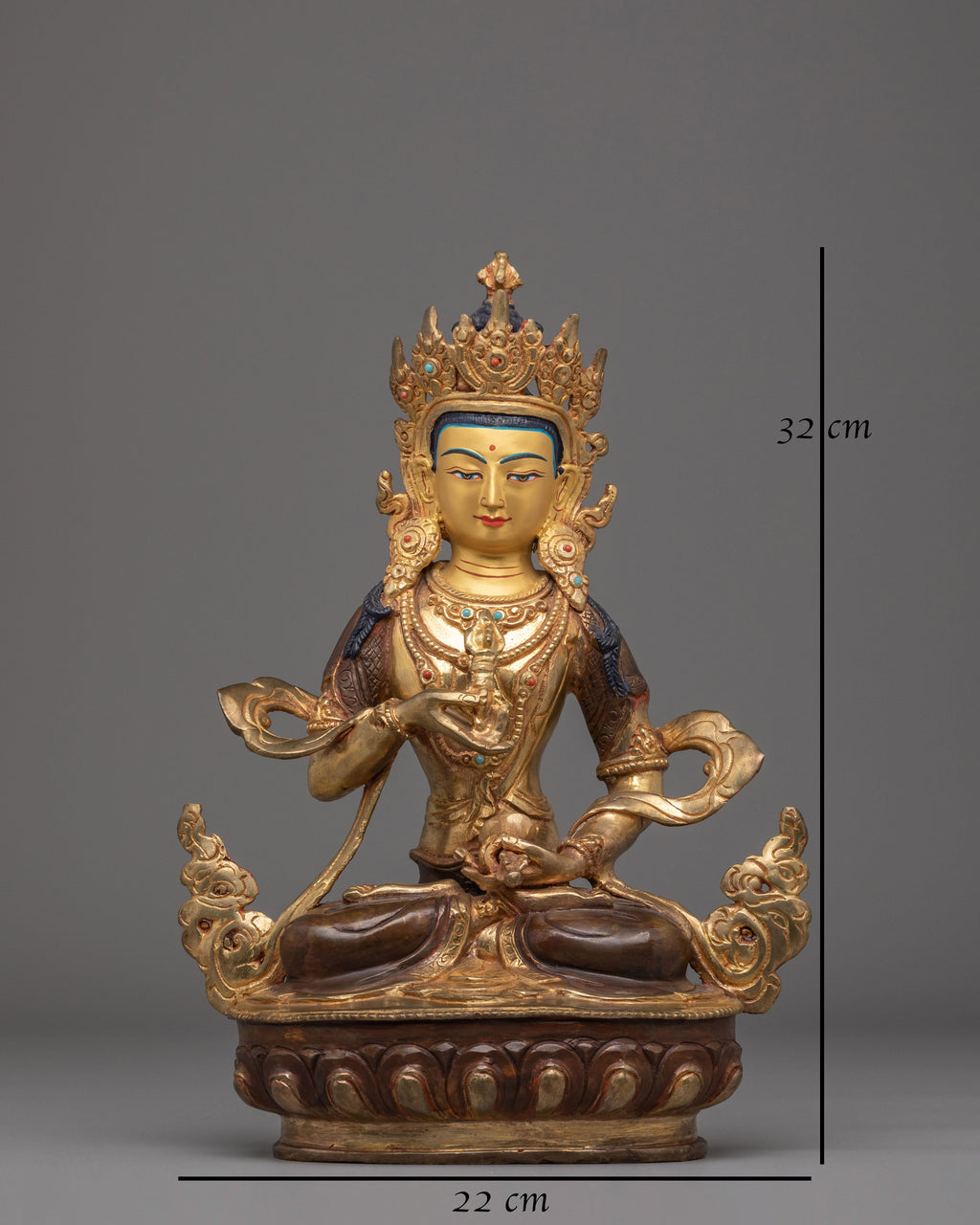 This Sacred handmade Vajrasattva statue stands as a profound symbol of spiritual purity and enlightened clarity. Crafted by skilled artisans from oxidized copper with delicate gold plating, the 32cm-tall figure radiates timeless elegance and a reverent energy. Weighing 2.87kg, its substantial presence makes it an ideal focal point for meditation spaces, altars, or sacred rooms. The masterful detailing captures every nuance of traditional craftsmanship, while the warm patina of oxidized copper, combined with radiant gold accents, creates a spiritually uplifting aesthetic. Whether you seek a powerful spiritual companion or a stunning artistic investment, this statue embodies the transformative essence of Vajrasattva's teachings on purification and enlightenment.