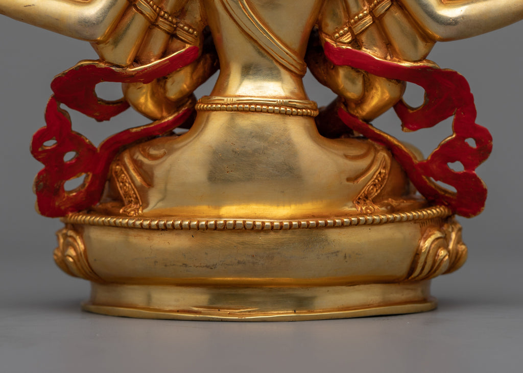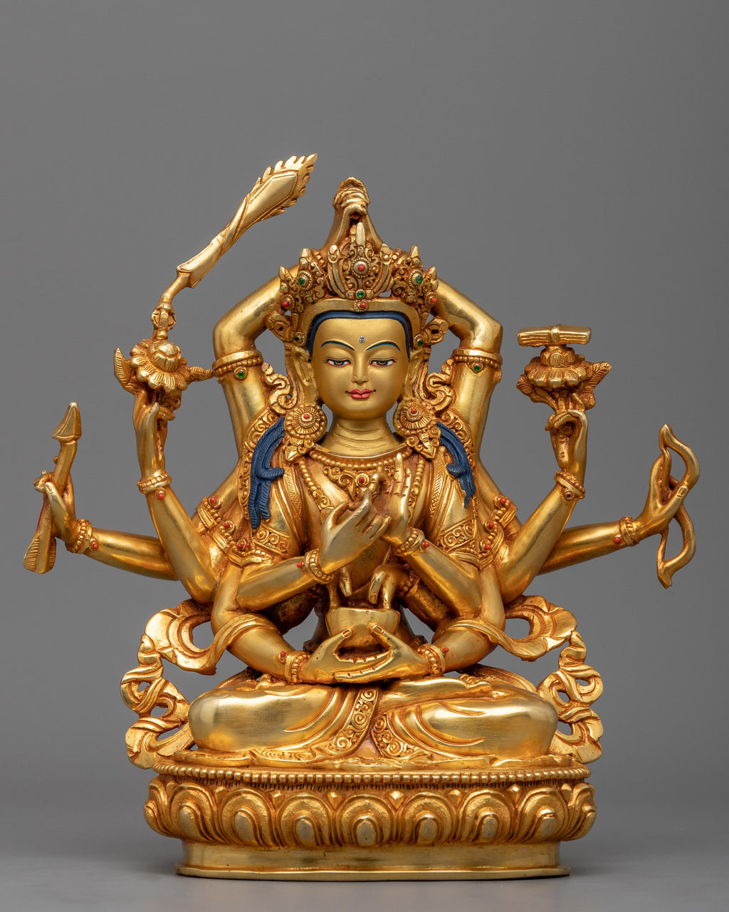 The Namasangati Manjushri Statue was expertly carved in our studio using sophisticated design patterns that can only be seen in the Kathmandu valley. The statue was expertly crafted with copper and gilded with 24k real gold. We have used acrylic paintings to highlight the deity's facial attributes. This form is generally referred to as Namsangati. He is seen sitting on a moon-disc lotus seat. His primary hands express dharma chakra mudra. The arms on the right hold a flaming sword and arrow, while the left holds the prajnaparamita on a lotus and a bow. The two hands below the primary hand hold an alms bowl resting on the lap. The complex design of this statue took us months and months of hard work to complete. We used a hammer and small chisels to hand-carve the intricate design patterns. To do delicate carvings, artists must have decades of experience as he has to create intricate design patterns on a small surface area.