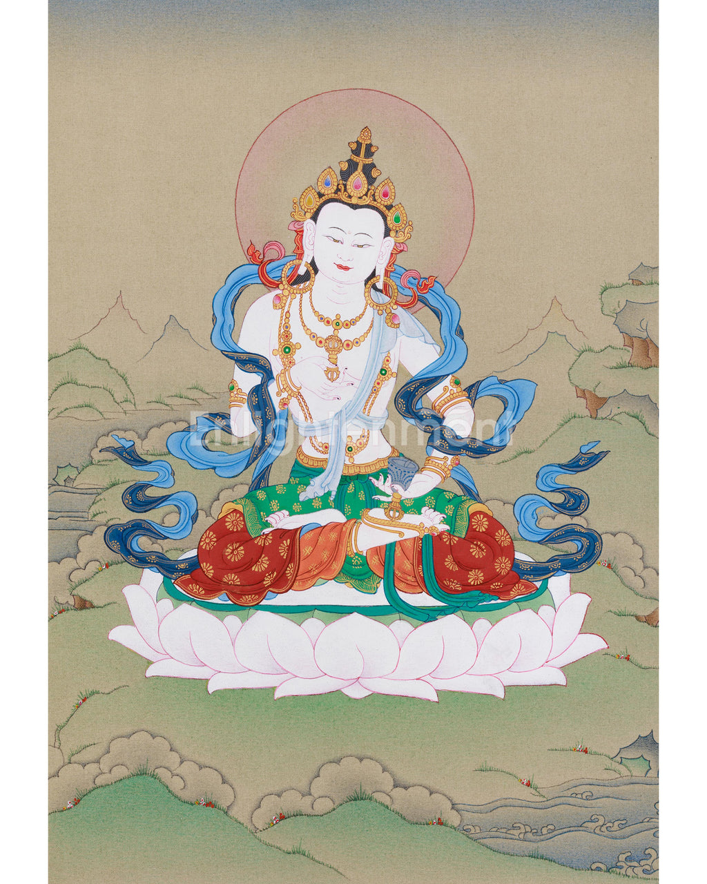 Divine Purifier Deity Vajrasattva Thangka is an outstanding hand-painted work of art, created on cotton canvas using 24K gold and natural stone hues. The use of gold accentuates the sacred glow of Vajrasattva, and this thangka is made in the traditional Karma Gadri manner. His figure, which emphasises his spiritual purity and the transformational power of his purification practice, is exquisitely designed with rich hues that represent his symbolic qualities. This thangka, which channels the energy of Vajrasattva to purify the mind and soul, is not just a work of art but also a tool for meditation and healing.