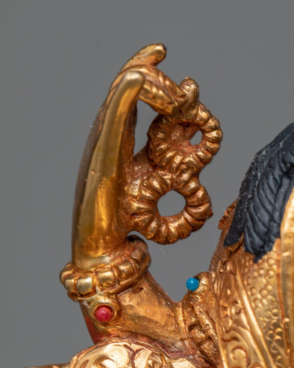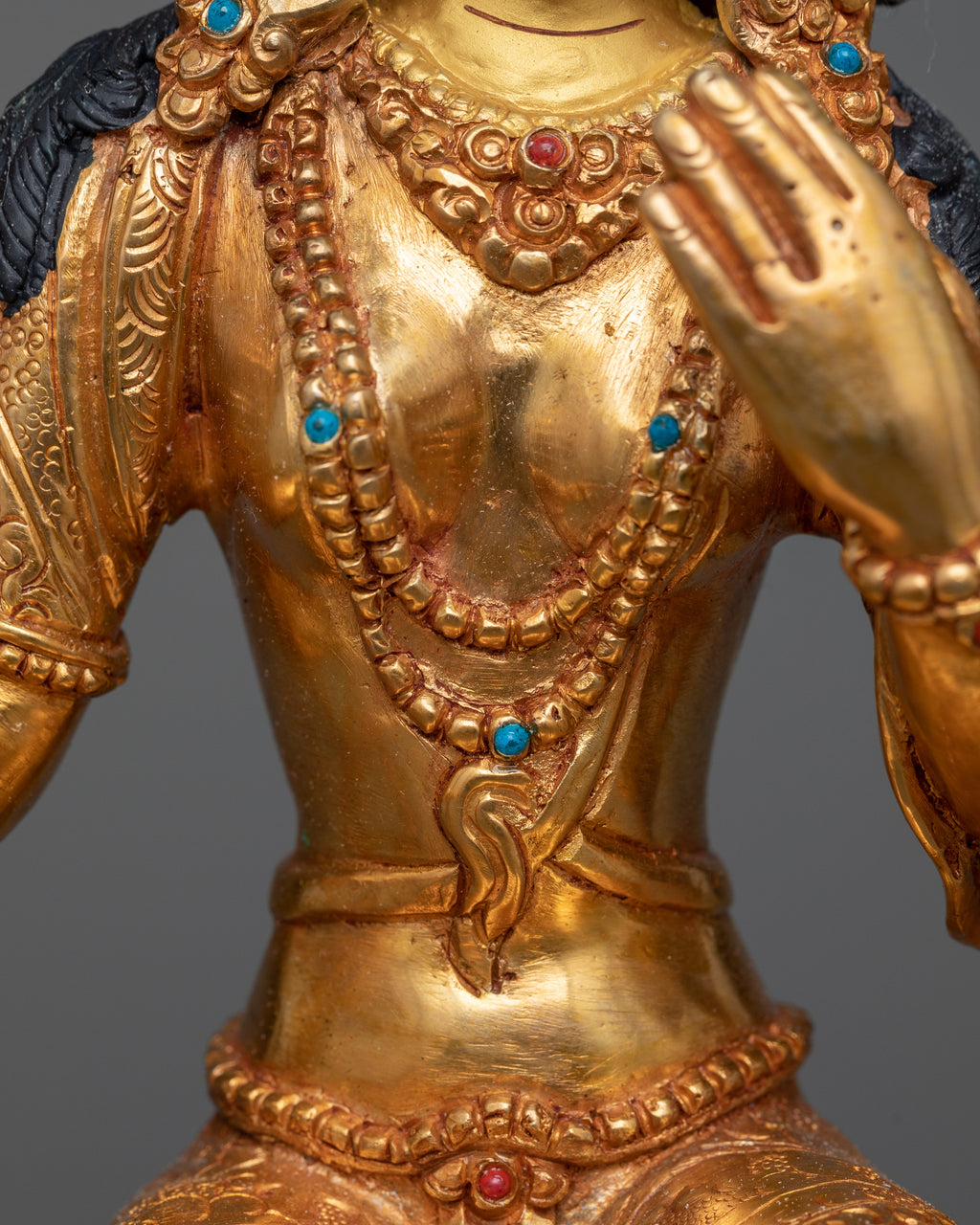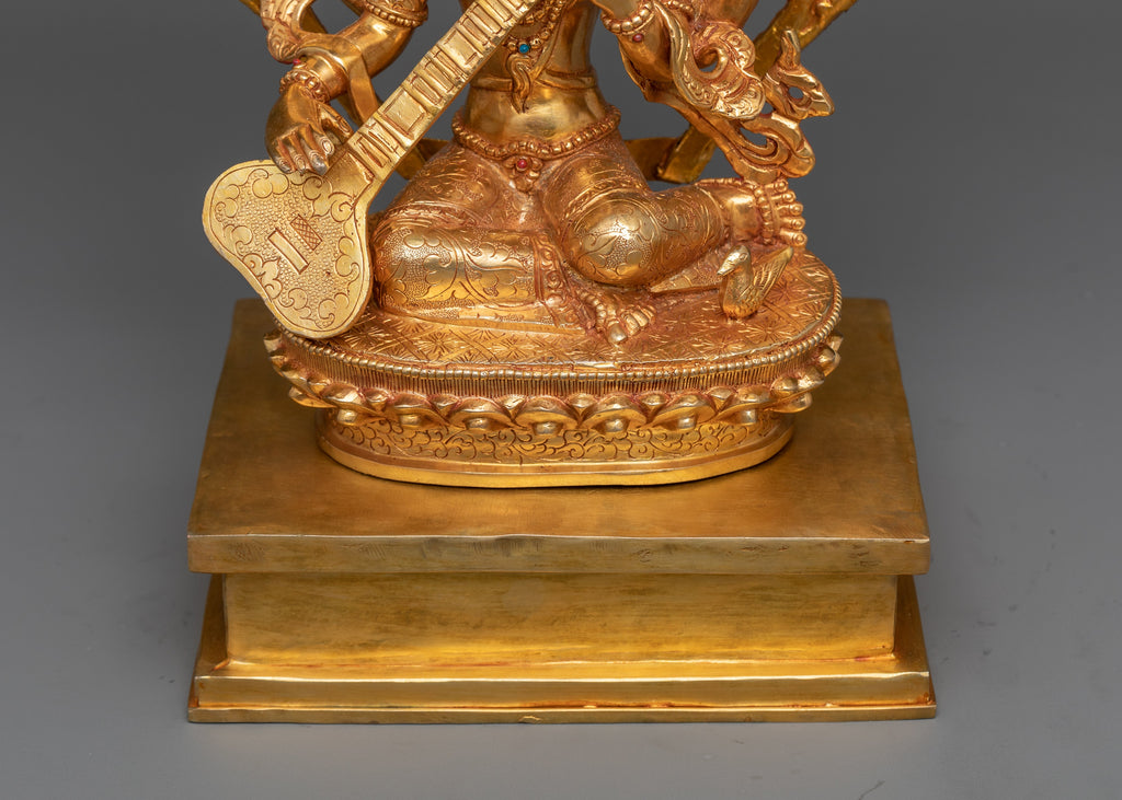 This sculpture, made of high-quality copper and gilded in 24K gold, is a work of art by Nepalese artisans. The gold and acrylic paints enhance Goddess Saraswati's ethereal beauty, highlighting her tranquil grace and profound wisdom. This statue's finely calibrated size and weight make it an ideal addition to any environment, instilling tranquility and inspiration.