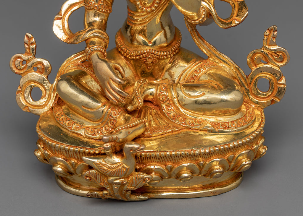 The sculpture is made of copper and is gilded with 24K gold to give it a celestial radiance. The gold and acrylic paintings add to its elegance, expressing Saraswati Ma's grace and calm. The scale and weight of this statue make it a great complement to any place dedicated to contemplation, learning, or artistic expression. Saraswati Ma, shown here in her traditional form with a veena, a musical instrument, represents the unity of the arts and sciences.
