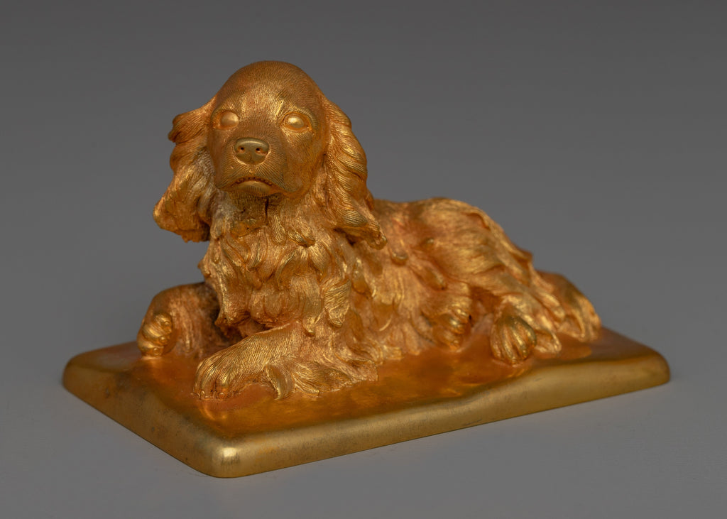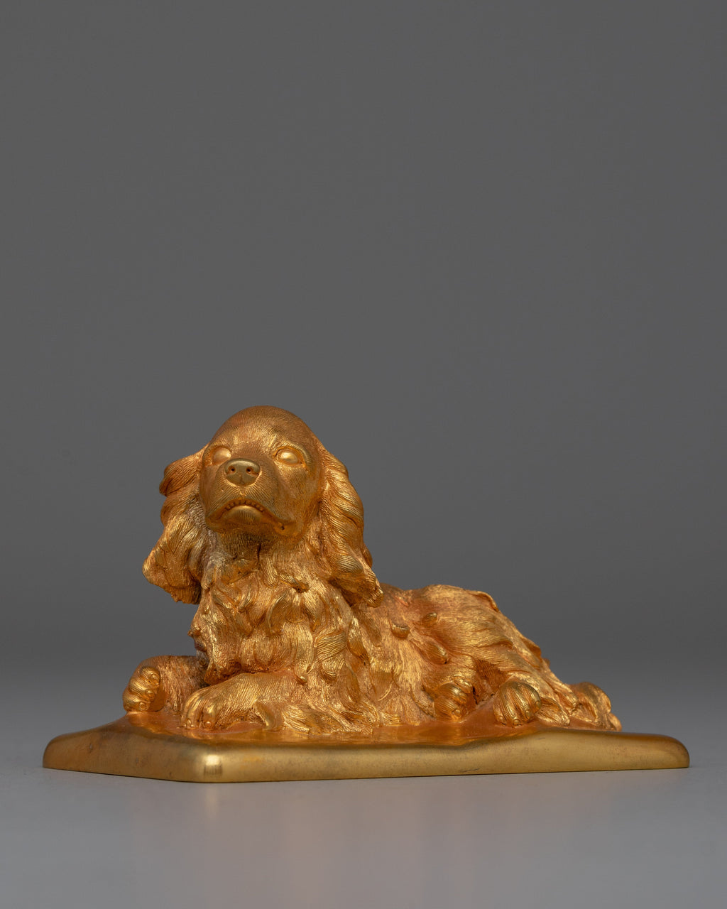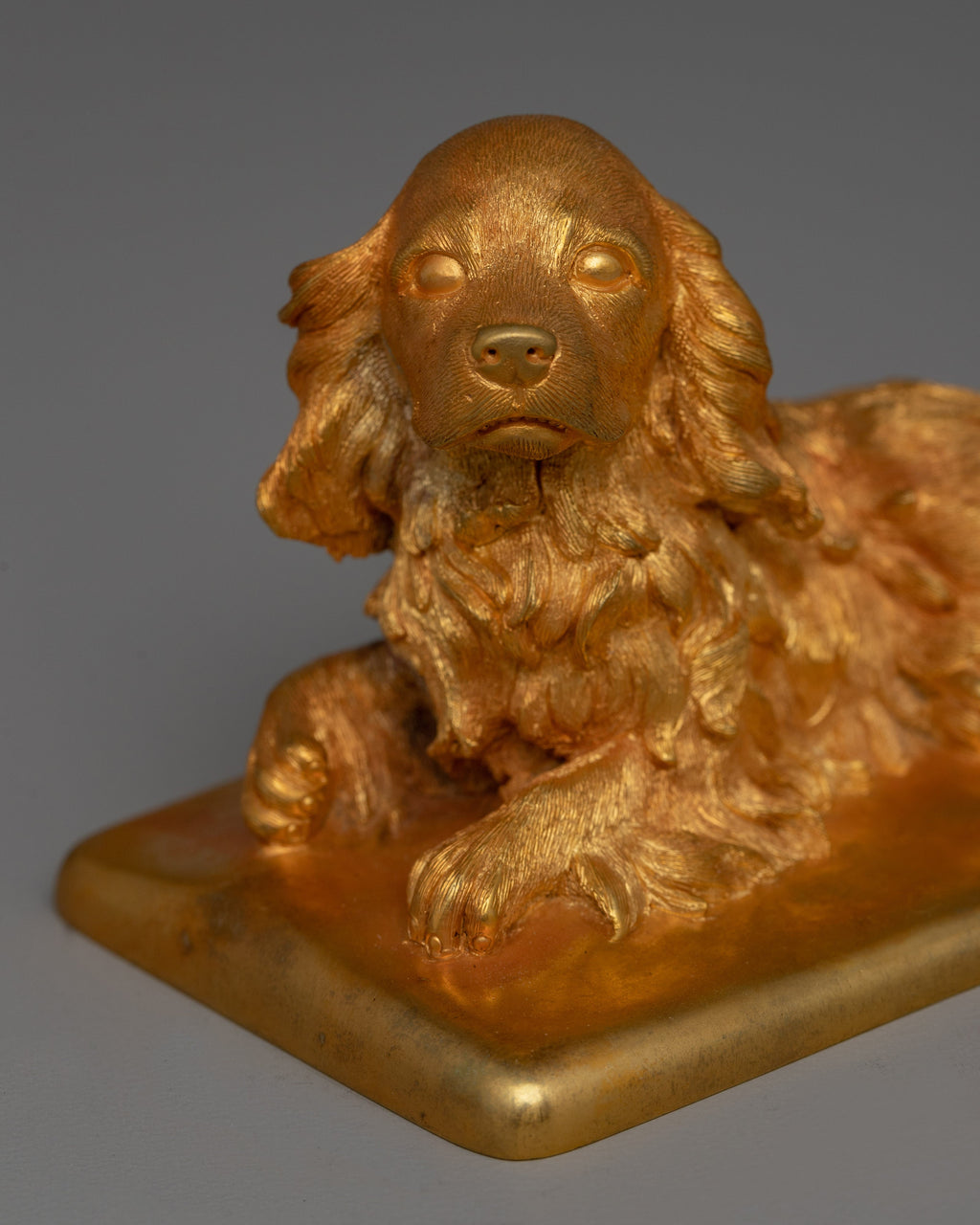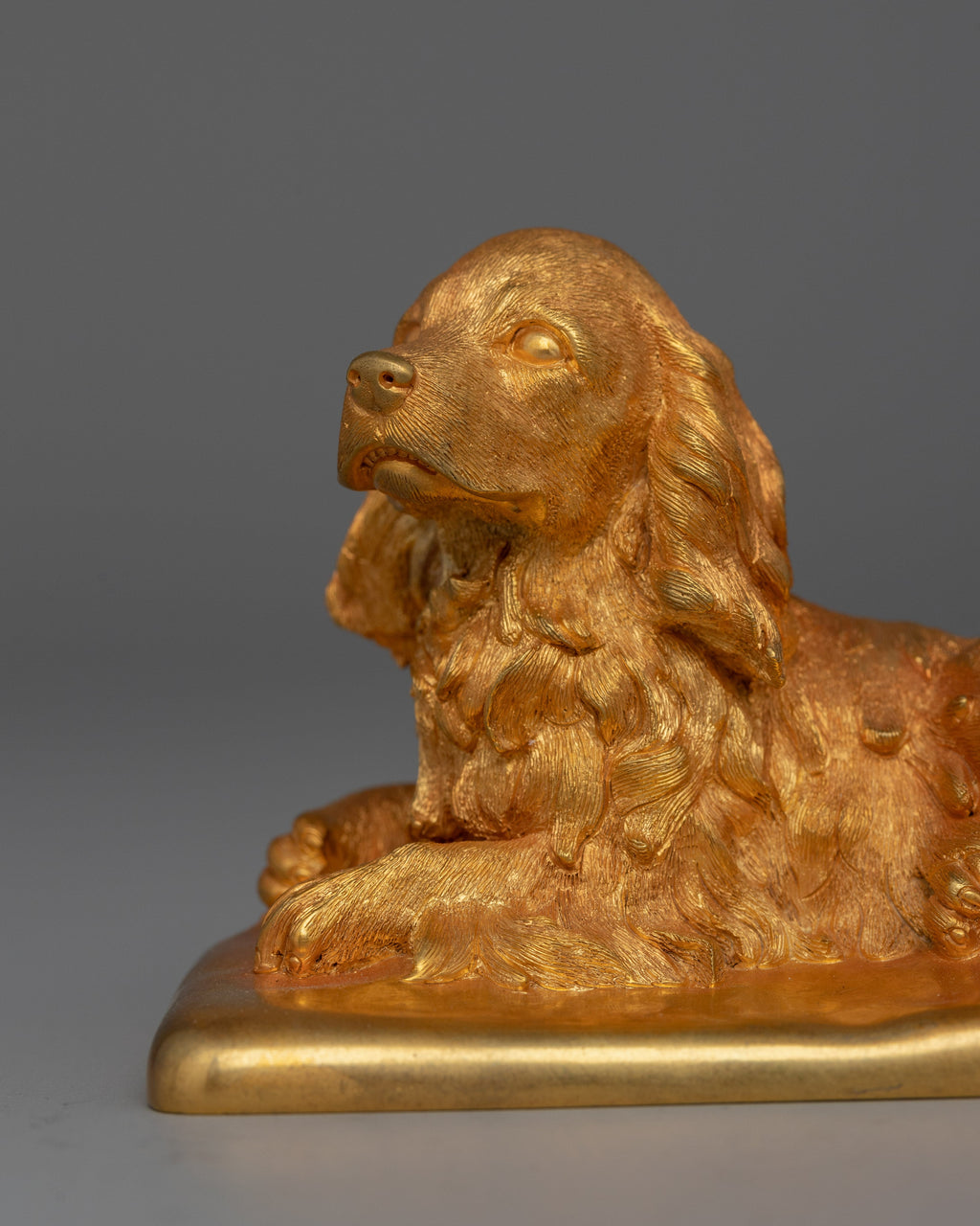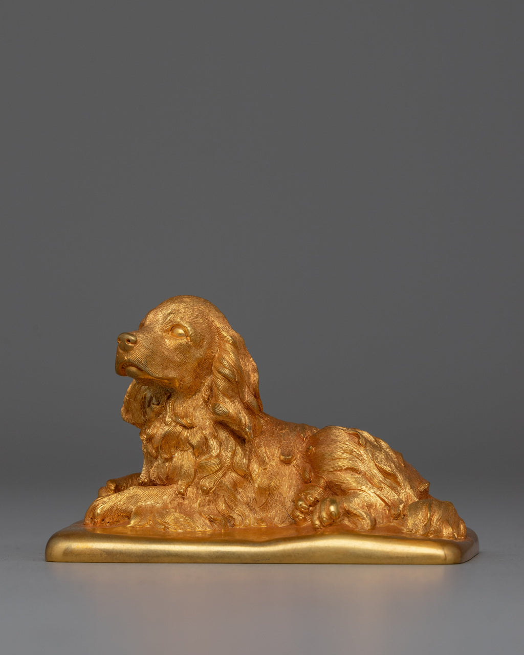 The shrine portrays a sense of tranquility and loyalty, characteristics frequently associated with dogs. Every curve and texture on the image illustrates the artist's devotion to detail, from the significantly textured fur that flows organically over the dog's body to the sophisticated expression on its face. The electro gold plating lends an energetic sheen to the statue, giving it a sophisticated and elegant appearance that makes it suitable for exhibition in living spaces, offices, or as the main attraction in fine art collections.