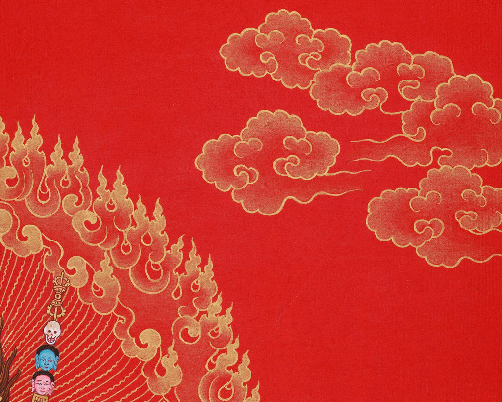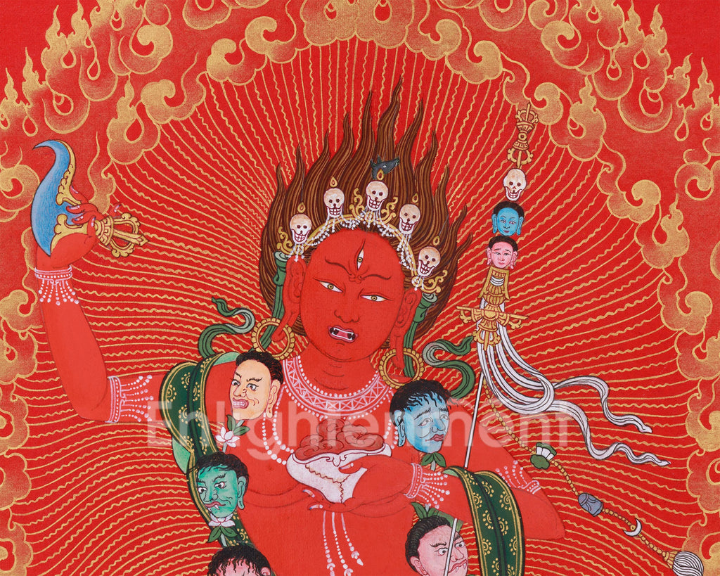 Discover the empowered feminine energy with this stunning Dorje Phagmo thangka, a beautifully hand-painted artwork on fine cotton canvas. It features vibrant acrylic colors and authentic 24K gold, created in the traditional Nakthang (gold on red) style. This thangka vividly depicts wrathful wisdom, where divine power meets fiery intensity. The deep red background symbolizes the fire of wisdom and the transformation of ignorance. It is carefully painted with gold patterns applied with a brush, giving it a luxurious texture that shines in light and reflects the fierce energy of Dorje Phagmo.