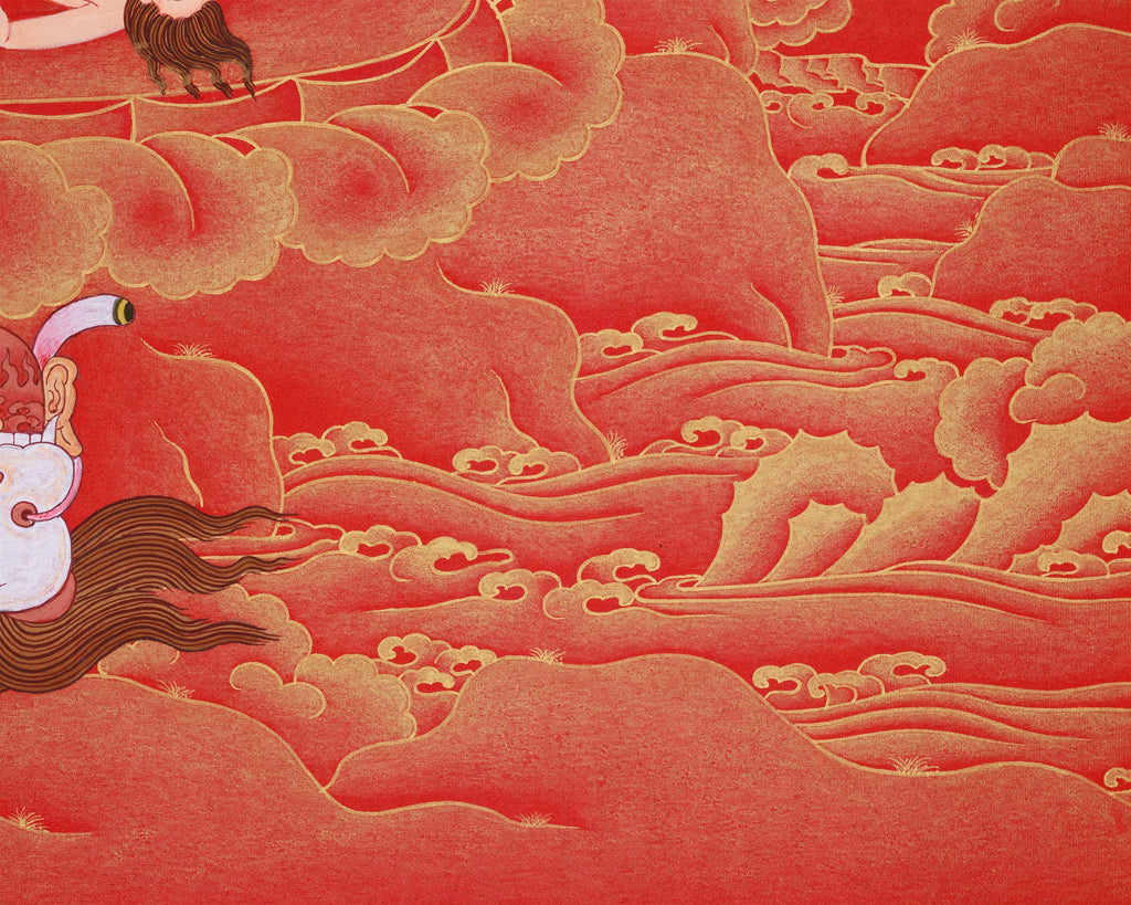 This Dorje Phagmo thangka is more than just a visual masterpiece; it serves as a sacred spiritual tool, perfect for tantric practitioners, meditators, or collectors of rare, empowered Buddhist art. It embodies the raw, transformative energy of the enlightened feminine, making it ideal for energizing meditation rooms, altars, or temple walls. Whether used in ritual practice or appreciated as sacred art, it acts as a powerful reminder of our ability to cut through illusion and realize the true nature of the mind.