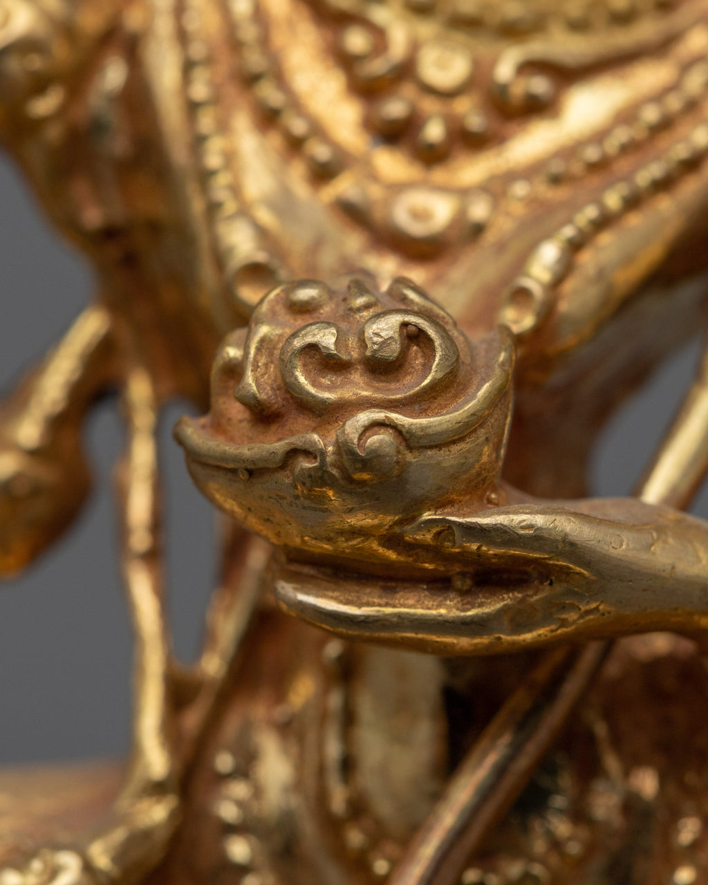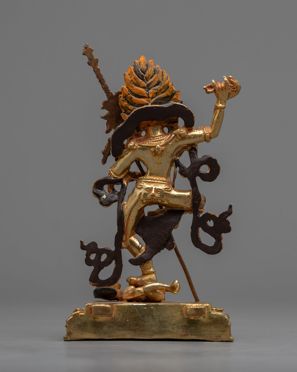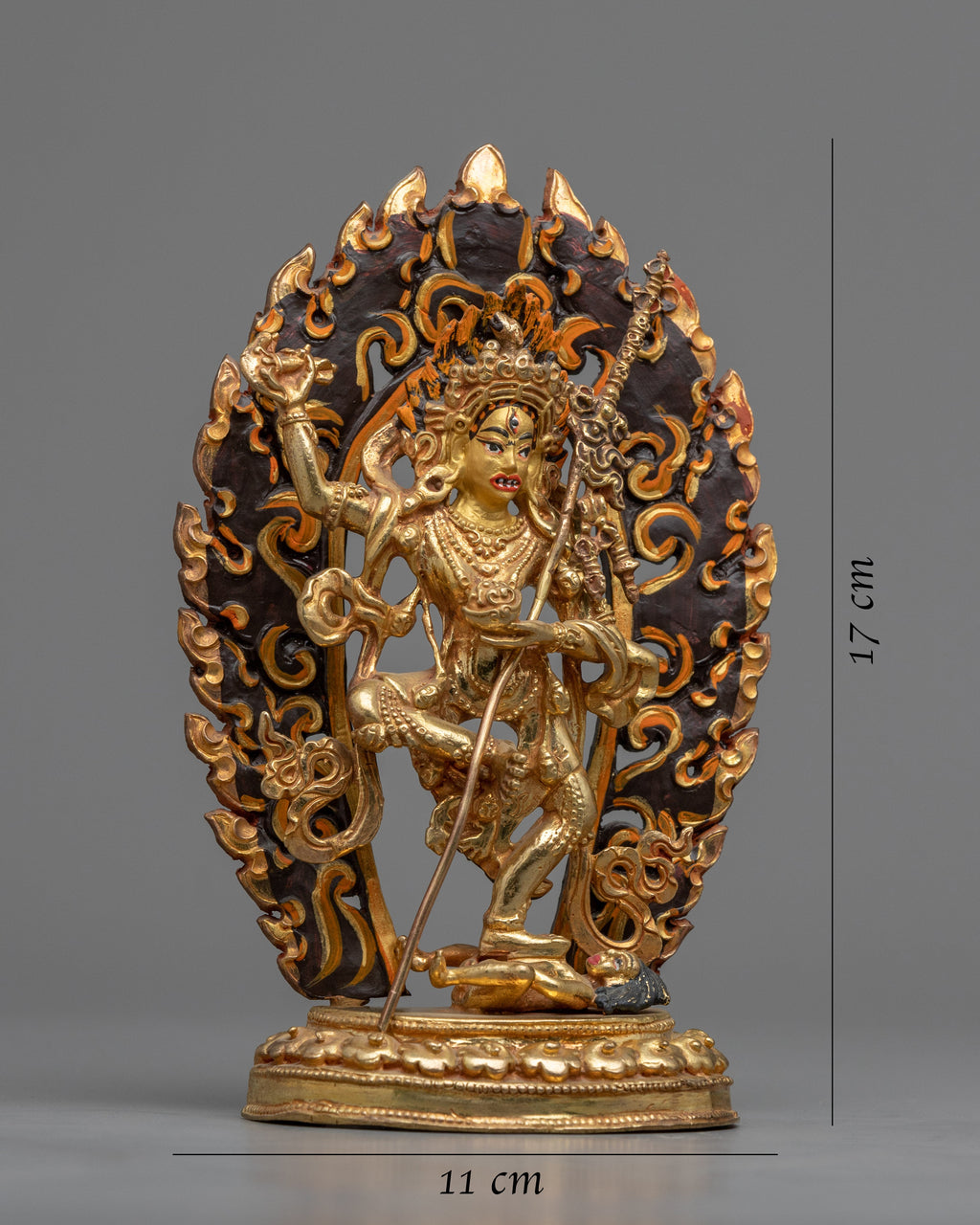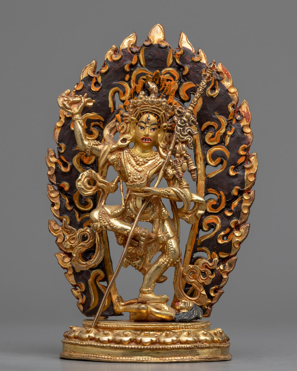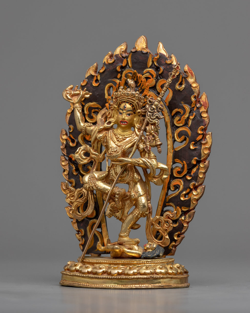 The magnificent Dorje Phagmo statue was hand-carved in Nepal using traditional Himalayan techniques. This piece is comprised of fine copper, which is then gilded with gold that gives it a lustrous final look. Here, in the statue, the deity can be seen standing atop a human figure with a wrathful countenance that represents the triumph of good over evil. She is carrying a trident on the arc of her left hand as she is engulfed by fiery flames.