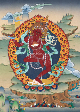 The deity known as Dorje Phagmo or Vajravarahi is a fierce representation of the goddess Vajrayogini. She is known for her transformative abilities, wisdom, and protective powers. In this artwork, she is portrayed with a red body, wearing a crown made of five skulls on her head and a necklace of severed heads around her neck. She is often depicted standing, holding a curved knife and skull cup in each hand. For the Vajrayana practitioners, this Vajravarahi thangka print will be helpful to inspire your practice.