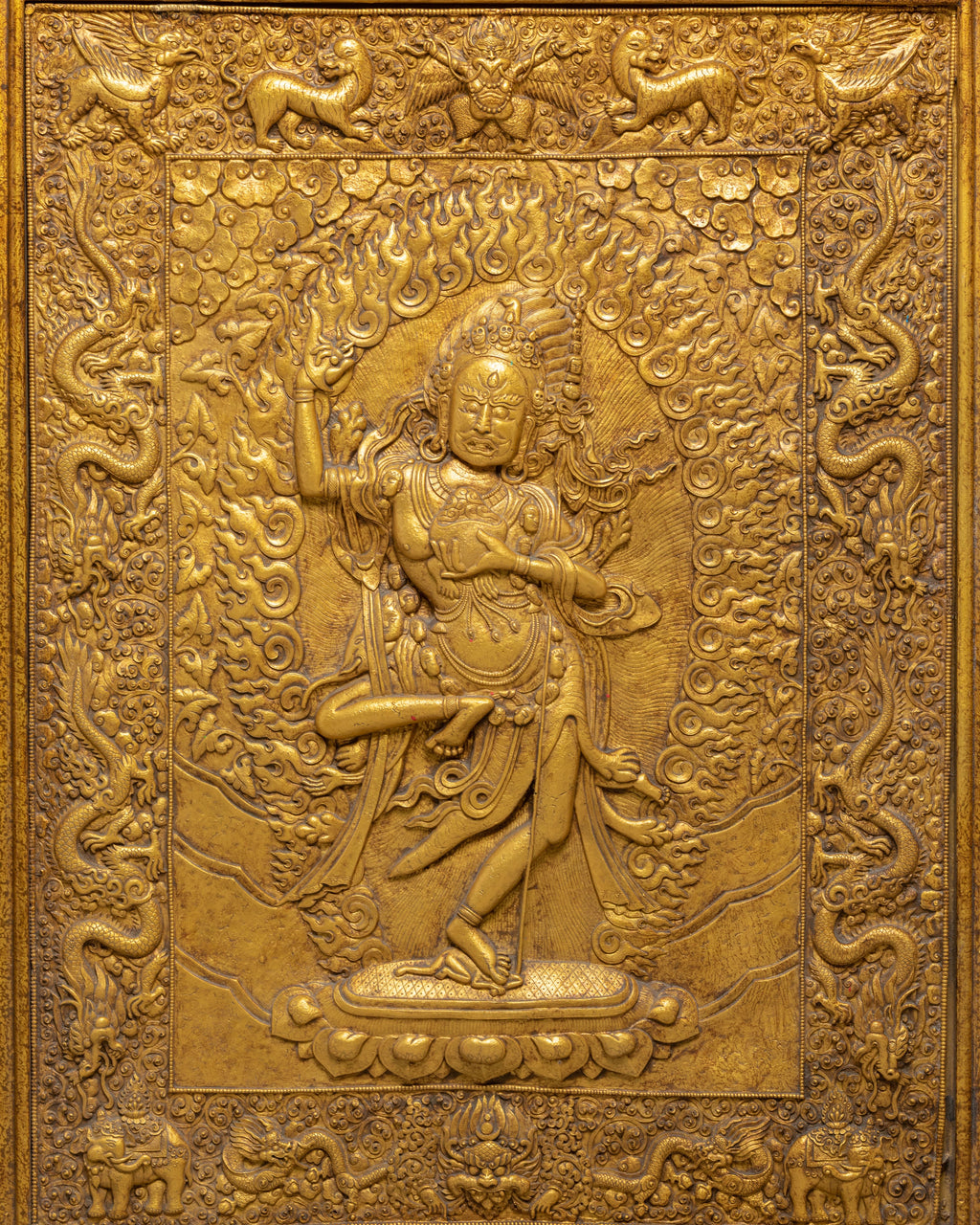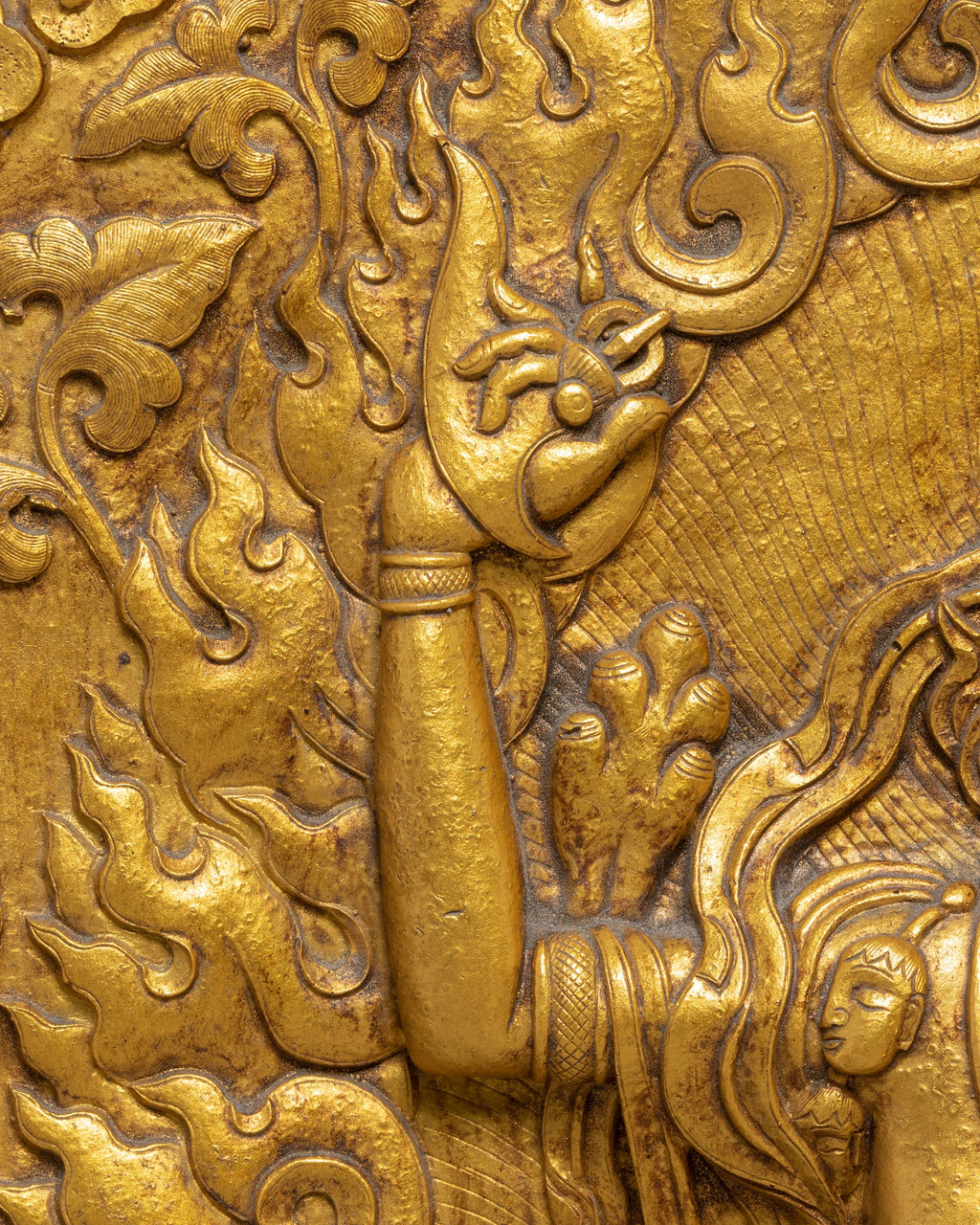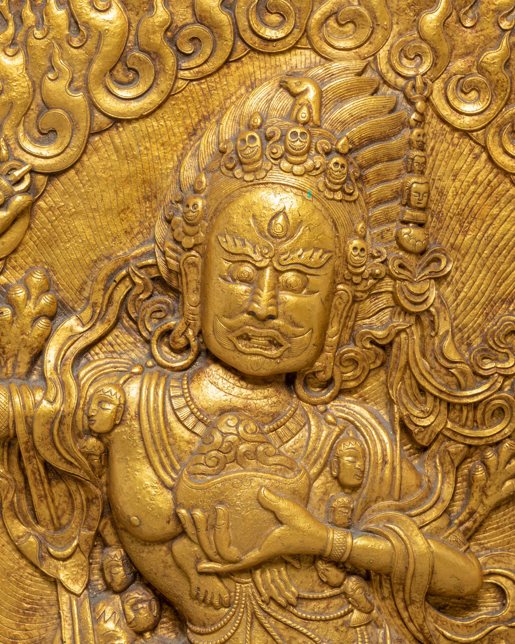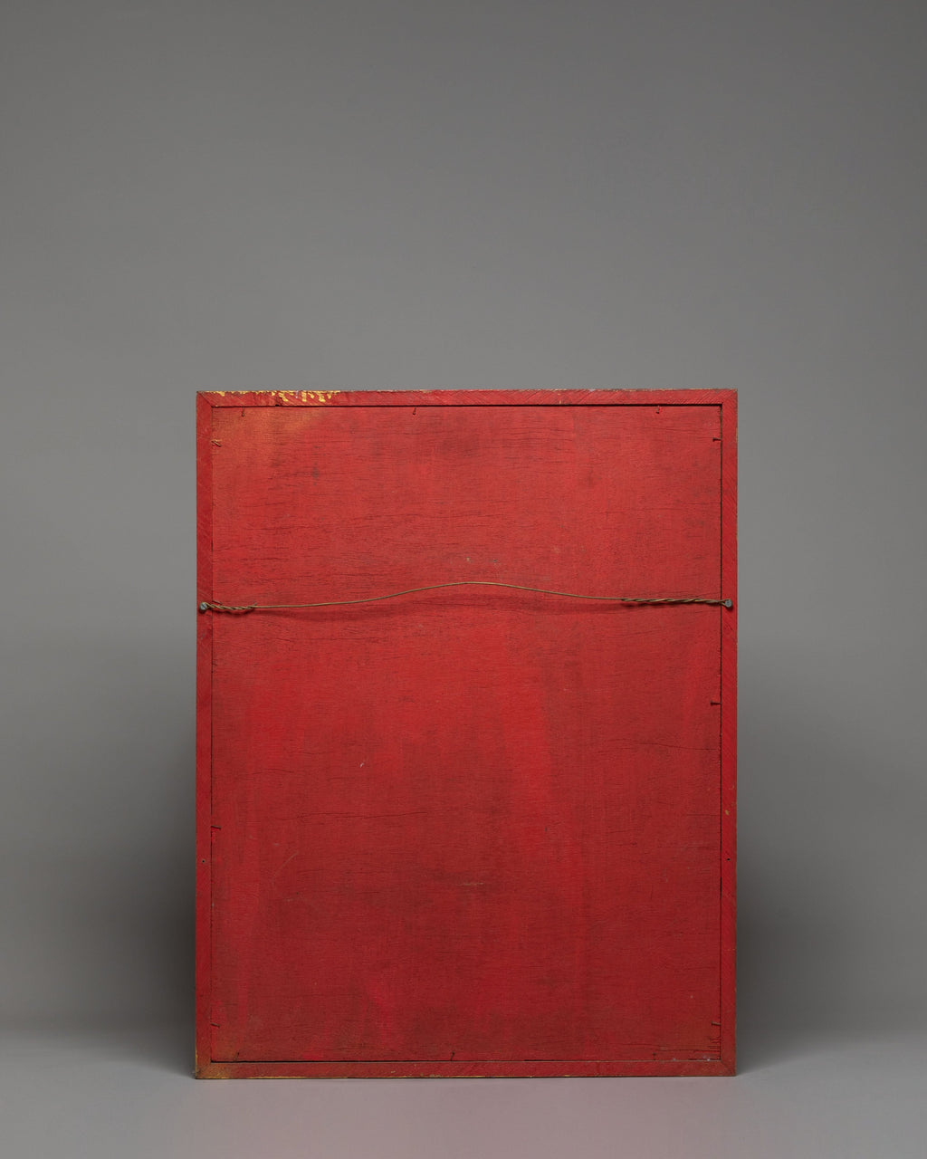The design of the Dorje Phagmo Thangka features the goddess seated on a lotus throne, radiating divine power and spiritual insight. The intricate details of her figure include dragons, lotus petals, and sacred symbols that enhance the piece's spiritual meaning. Dorje Phagmo’s multiple arms are depicted holding symbols of transformation, wisdom, and protection, each symbolizing her role as a protector and teacher of profound truths. The use of golden accents and rich, vibrant colors in the stone dust epoxy creates a dynamic contrast that draws attention to the goddess’s divine presence.