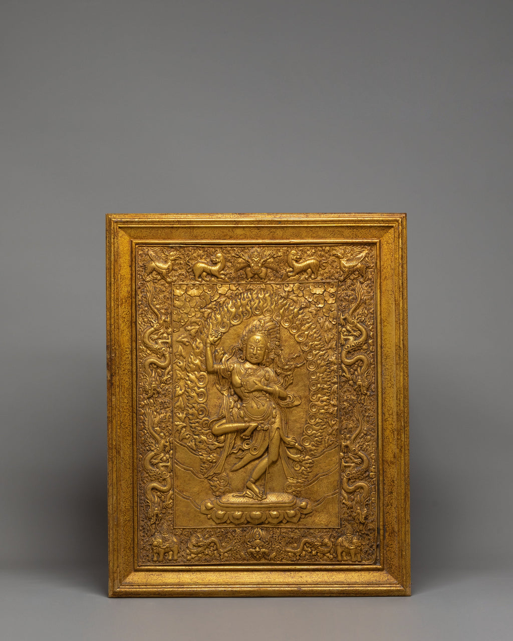 This Dorje Phagmo Thangka Wall Hanging is a powerful and spiritual piece of Tibetan art, representing Dorje Phagmo, the goddess of wisdom, power, and transformation. Measuring 73 cm in height and 57.5 cm in width, this wall hanging is meticulously handcrafted from stone-dust epoxy binding with a wooden back. Dorje Phagmo is a prominent Tibetan deity known for her fierce protection of Dharma and her ability to transform negative energy into wisdom. This artwork embodies her strength and divine energy, making it a potent addition to any spiritual space or Buddhist altar.