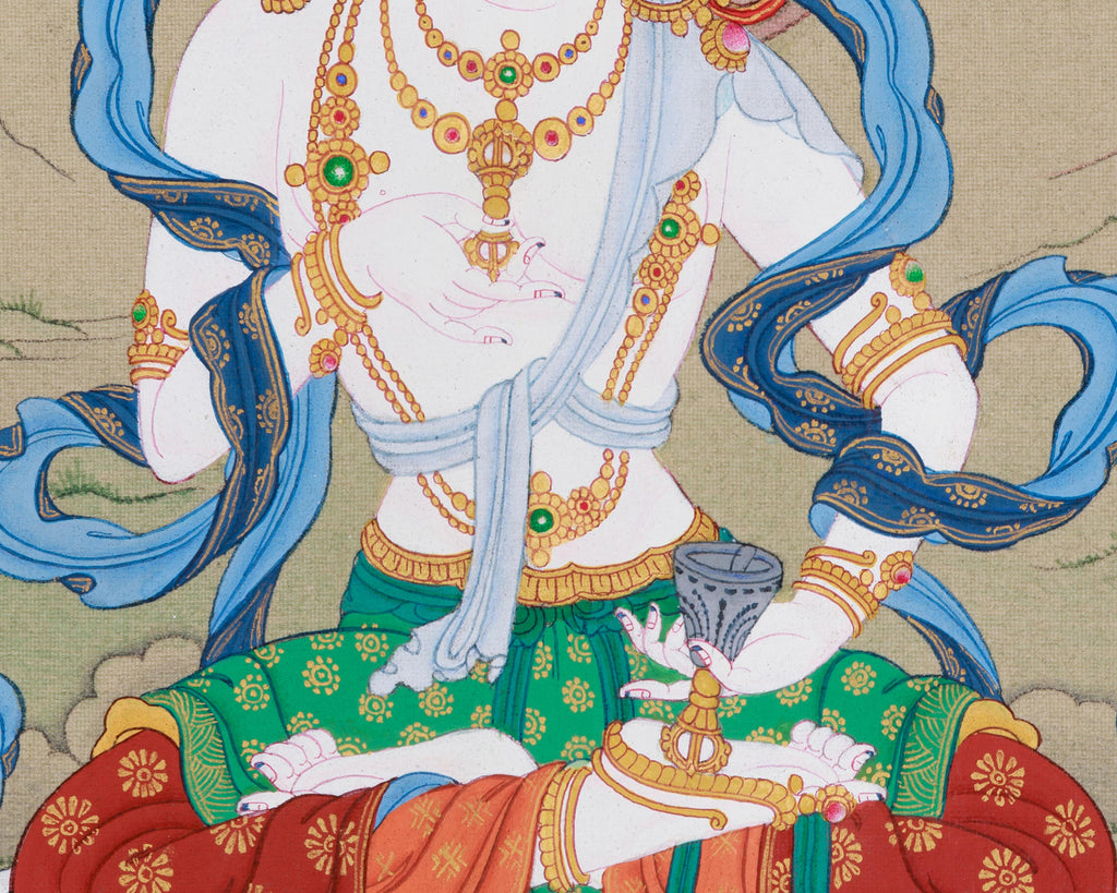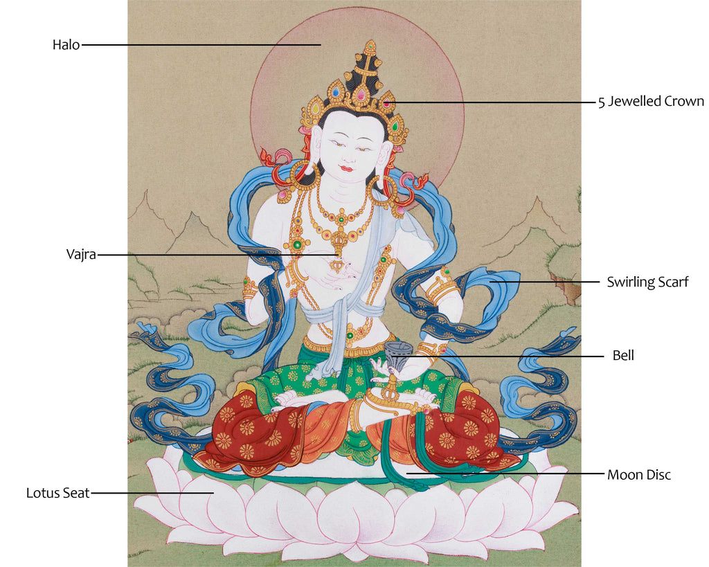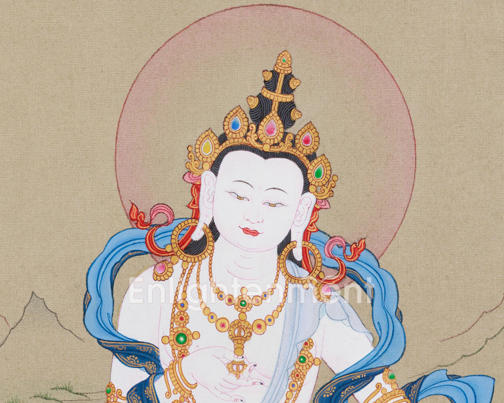 Vajrasattva, a key figure in Tibetan Buddhism, embodies purification and is invoked for removing obstacles and negative karma. Practitioners often recite the mantra "Om Vajrasattva Hum" to purify their hearts and minds, helping them overcome emotional and mental barriers. Depicted seated on a lotus throne in this exquisite thangka, he symbolizes spiritual awakening and purity. The divine attributes surrounding him emphasize his role in purification, and his tranquil expression exudes serenity. Adorned with an elaborate five-jeweled crown, a bell, a flowing scarf, and the vajra symbol, each element reflects different facets of his strength and wisdom. Order your Vajrasattva Thangka today to experience purification and invite his transformative energy into your space.