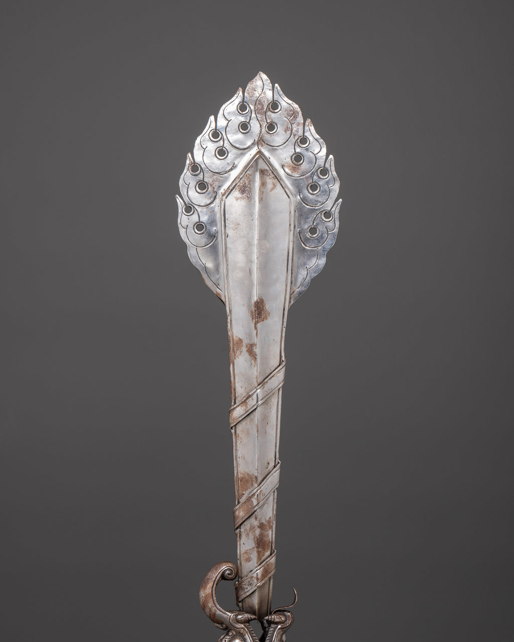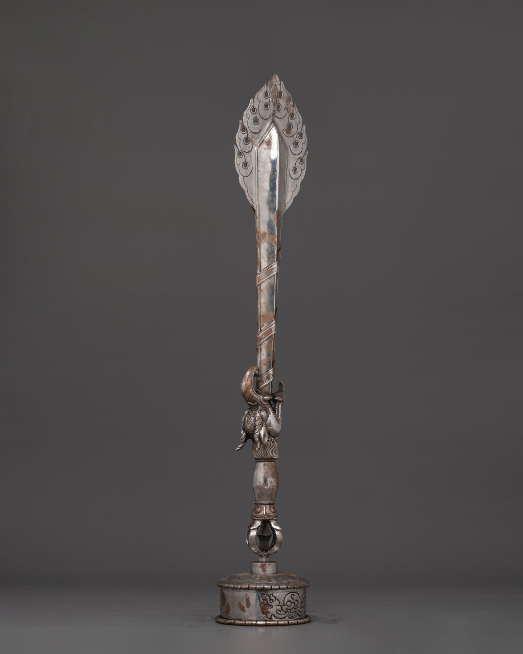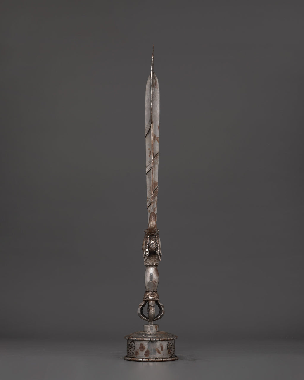 The elaborate craftsmanship exemplifies centuries of Tibetan artistry, blending spiritual power, meaning, and artistic beauty. This sword, whether utilized for ceremonial rites, altar decor, or as a distinctive collector's piece, reminds us of our inner strength and heavenly guidance. Its presence creates a dominating spiritual atmosphere in any space, making it an excellent choice for practitioners, healers, and enthusiasts of Eastern mysticism. When displayed on the supplied pedestal, this Tibetan ritual sword serves as a significant and influential centerpiece in your sacred space.
