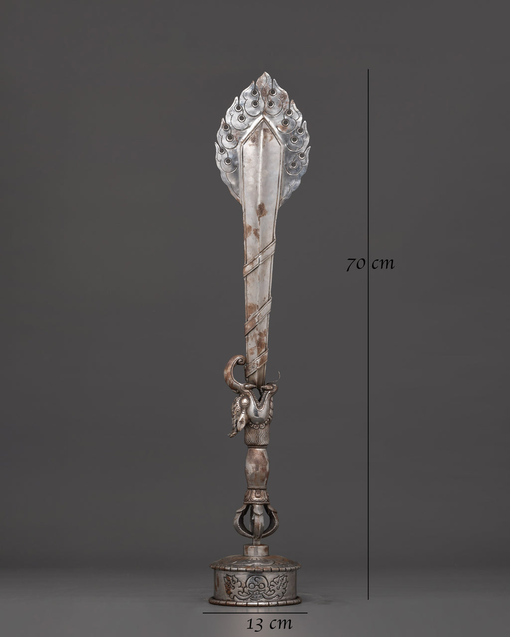 This Dragon-Head Ritual Sword with Stand features a beautiful, wrought iron blade adorned with classic Tibetan symbols, designed to invoke great spiritual energy. This ceremonial item, which stands 70 cm tall and 13 cm wide, features a half vajra at the base, a fearsome dragon head, and a dynamic flame pattern at the top, all of which express change, divine wisdom, and protection. This sacred sword has long been employed in Buddhist ceremonies and energy-clearing techniques, making it an ideal complement to any spiritual altar, meditation room, or ceremonial setting.