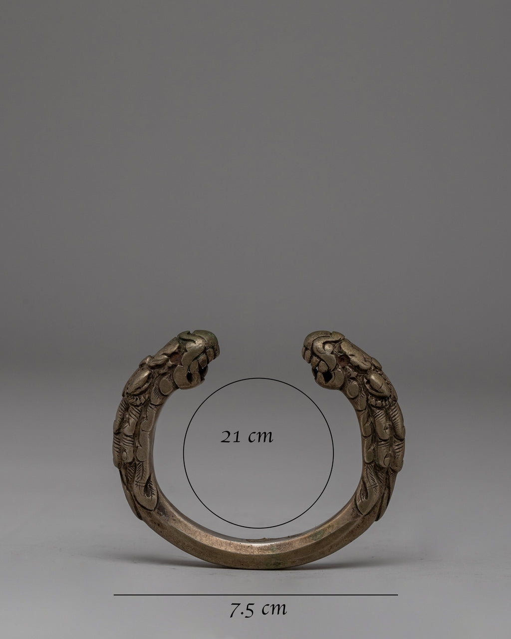 This Dragon Head Bracelet Set is a stunning piece of handcrafted jewelry, with intricate dragon head designs representing strength, protection, and power. These cuffs are made of white metal and measure 1.3 cm in height, 7.5 cm in width, and 21 cm in circumference, ensuring a comfortable fit. Each bracelet weights 0.112 kilogram, for a total set weight of 0.22 kg, making them both lightweight to make a powerful impression.