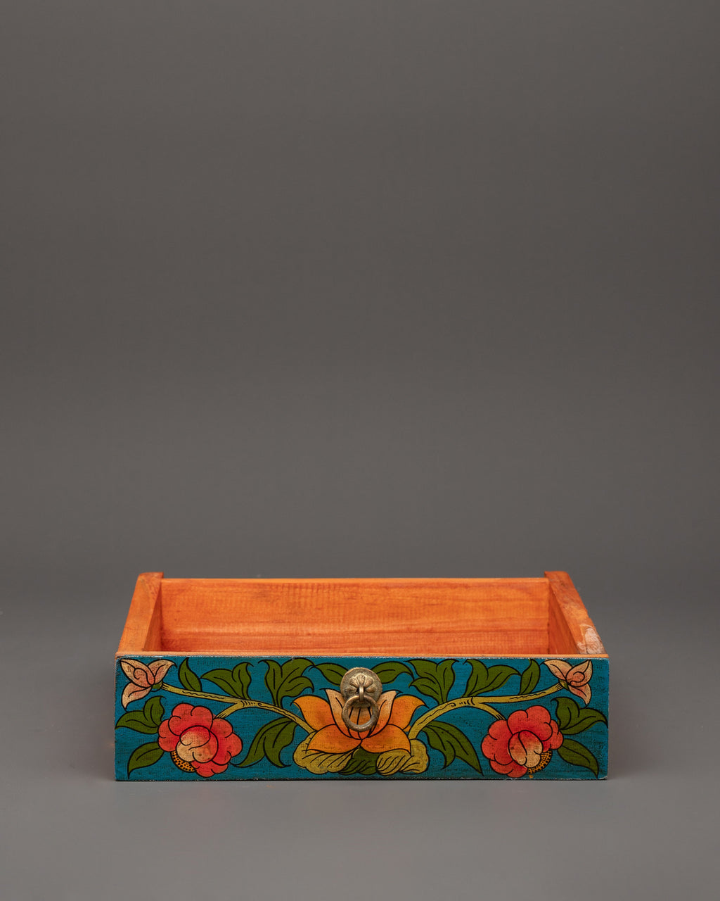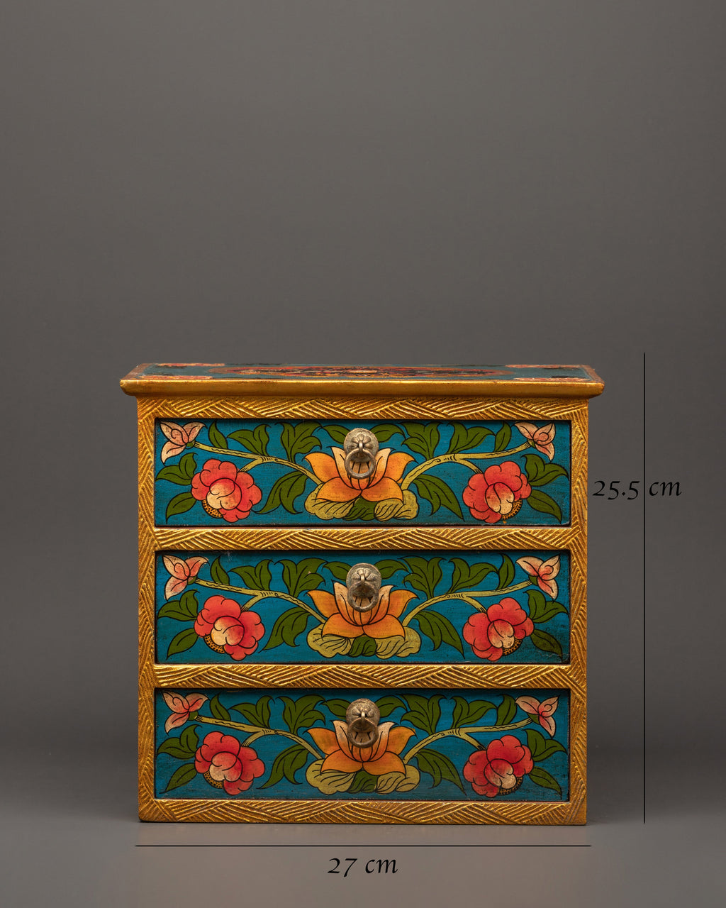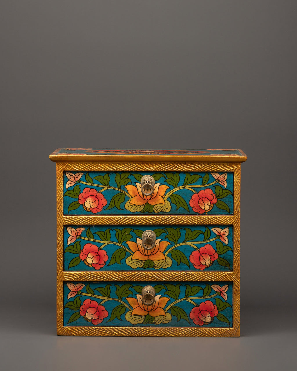 Traditionally Carved Tibetan Drawer Box | Hand-Painted Buddhist Art Box