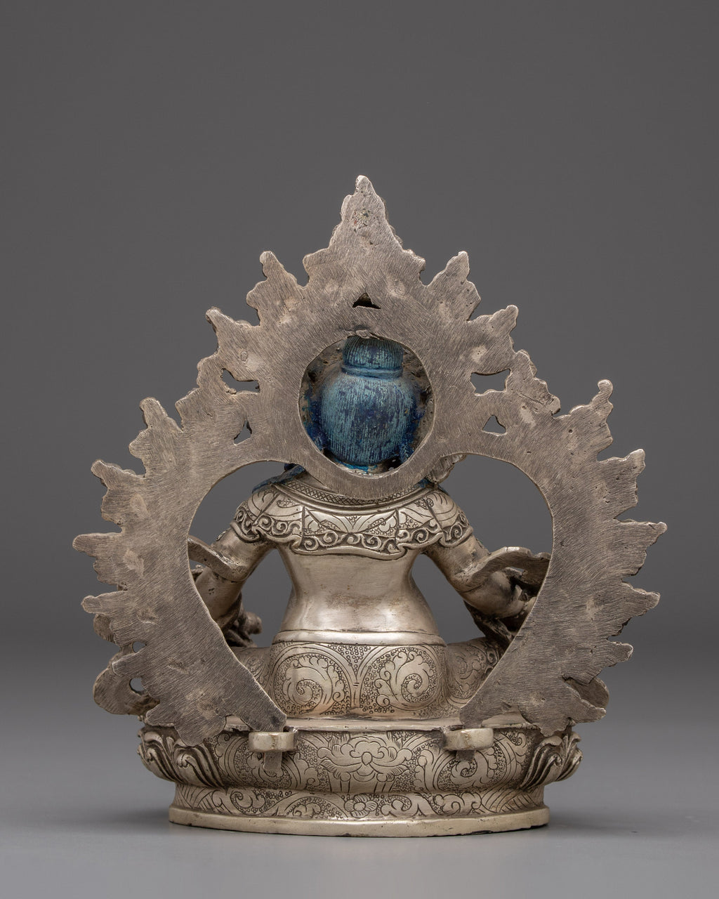 Dzambhala is depicted in a sitting position, holding a mongoose in his left hand to symbolize the removal of material and spiritual obstacles. In contrast, his right hand rests in the Granting Mudra with Citron Fruit. Dzambhala's strong yet sympathetic visage reminds practitioners of his protective nature and capacity to alleviate poverty by providing spiritual and practical gifts.