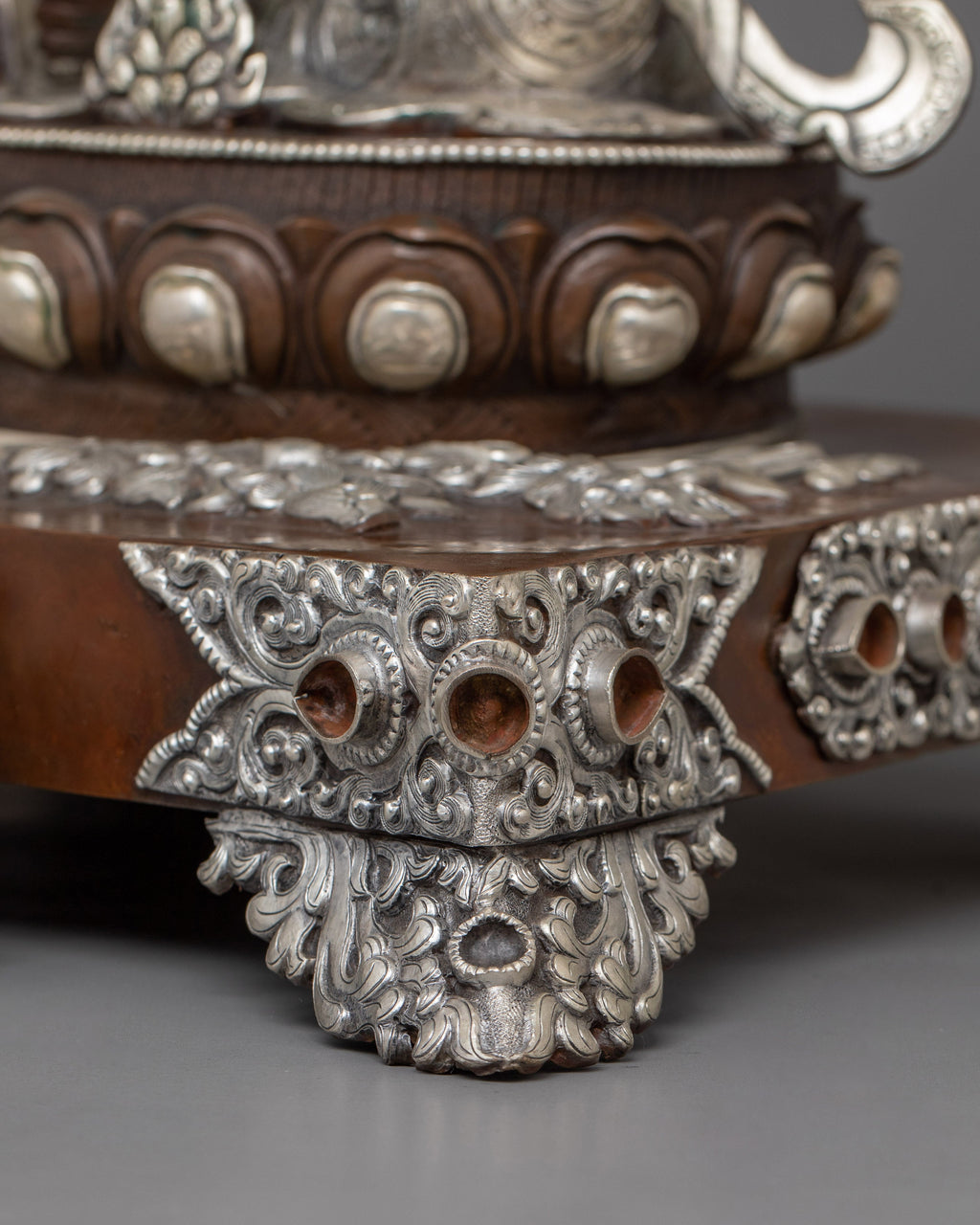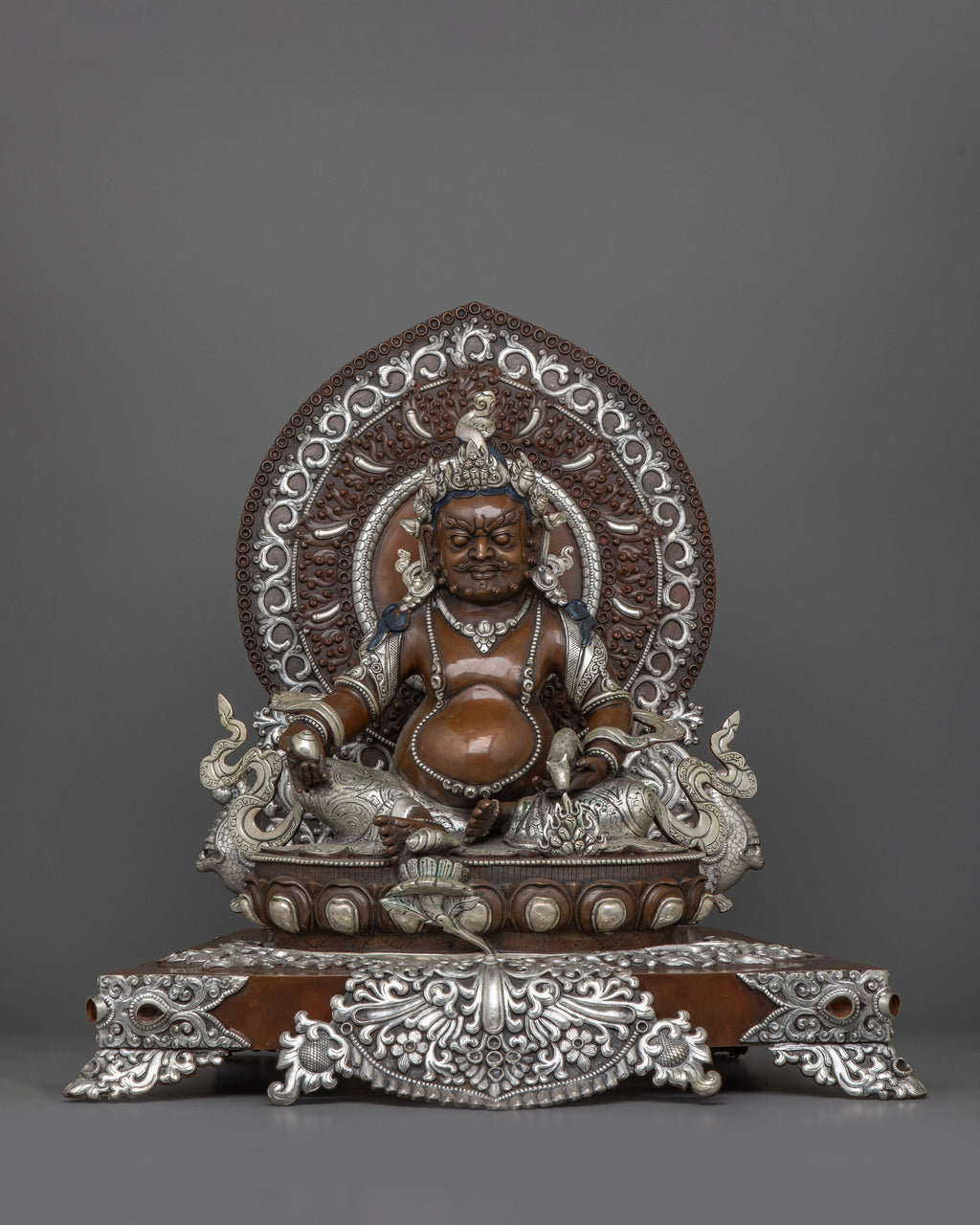 This Dzambhala Buddhist Wealth Deity Sculpture, the Buddhist deity of wealth and success, radiates divine assurance and great wealth. This stunning sculpture, which measures 16.1" (Height) x 17.5" (Base) and weighs 6.11kg, is hand-crafted from a copper body, enhanced with silver plating. It was created by professional Nepalese artisans and represents the sacred artistry of Himalayan workmanship, making it an exceptional centerpiece for altars, meditation places, and sacred collections.