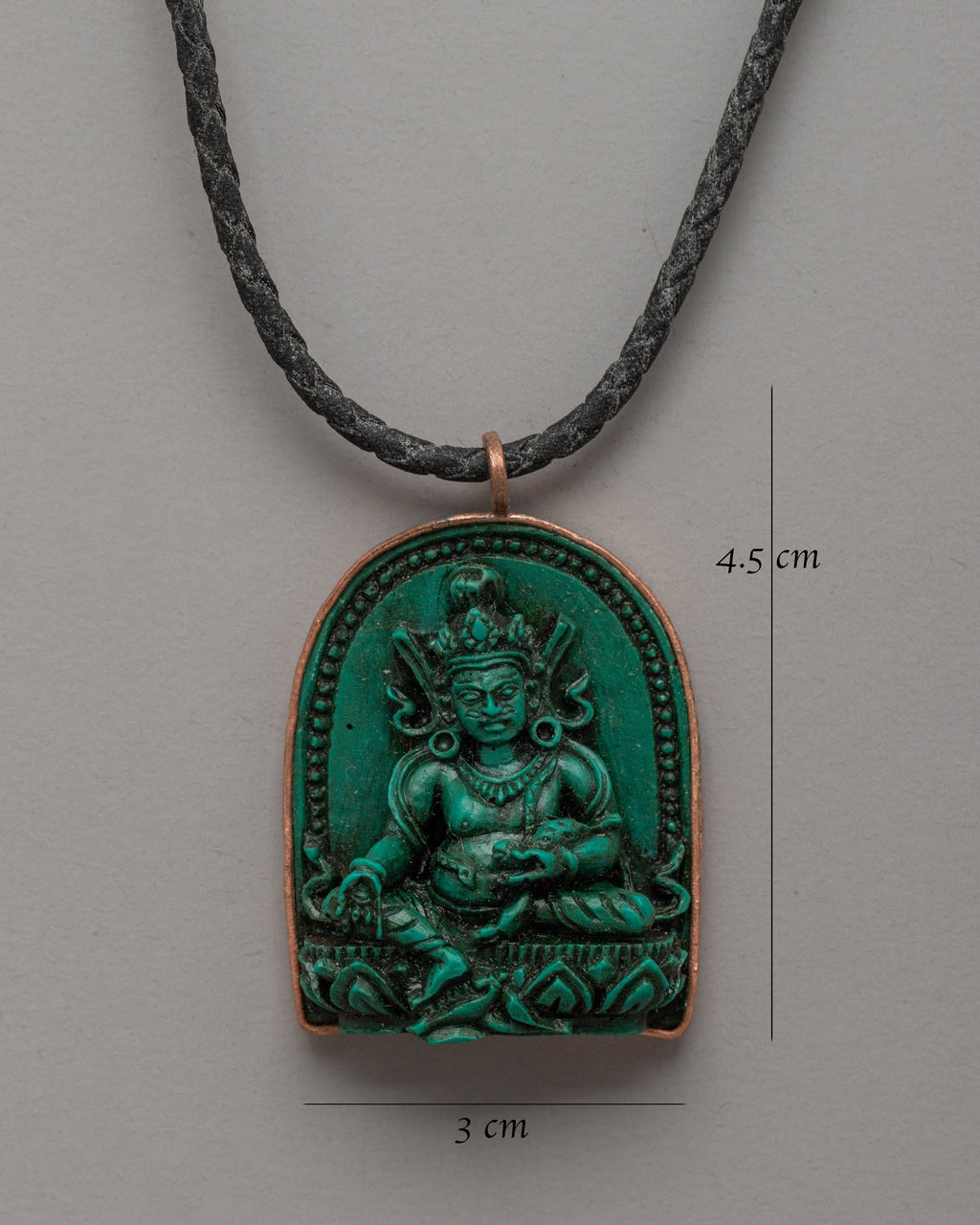 This Buddhist locket depicts the famous deity Dzambhala, the God of Wealth in Tibetan Buddhism. Dzambhala is represented in a seated position, emanating prosperity and compassion, with a mongoose in his left hand, representing the capacity to release unlimited treasures and remove financial impediments. In his right hand, he clutches a citron, which represents prosperity, good fortune, and abundance. The exquisite design depicts Himalayan artistry and brings Dzambhala's blessings into the wearer's life.