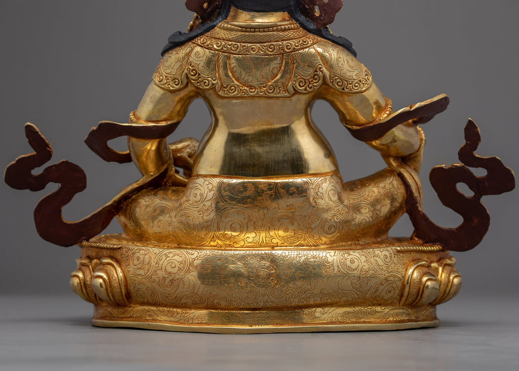In our studio, we have handmade Buddhist wealth deity of Gold Dzambhala Statue in traditional Himalayan art of Nepal. We have sculpted sacred deities of Buddhism for generations and always adhere to their authentic iconography while depicting them in the statue. Dzamabhala, also known as Kubera in Sanskrit, is sitting on the moon disc of the Lotus seat with a wrathful expression. He holds a mongoose in one hand and citron fruit in the other.