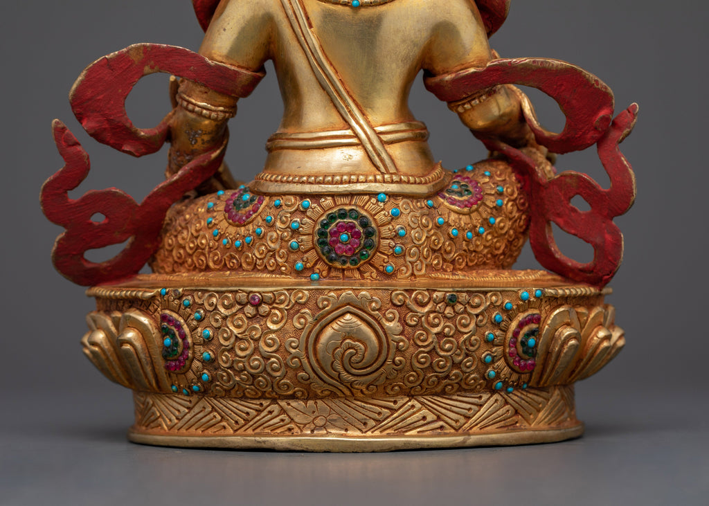 The statue's carefully wrought gems and lovely detailing of the mongoose all symbolize Dzambhala's wealth and kindness. The choice of gold enhances the statue's visual attractiveness while also symbolizing Dzambhala's celestial character. This statue is appropriate for individuals looking for art that promotes prosperity and spiritual growth in their surroundings, making it an excellent addition to homes or meditation places.