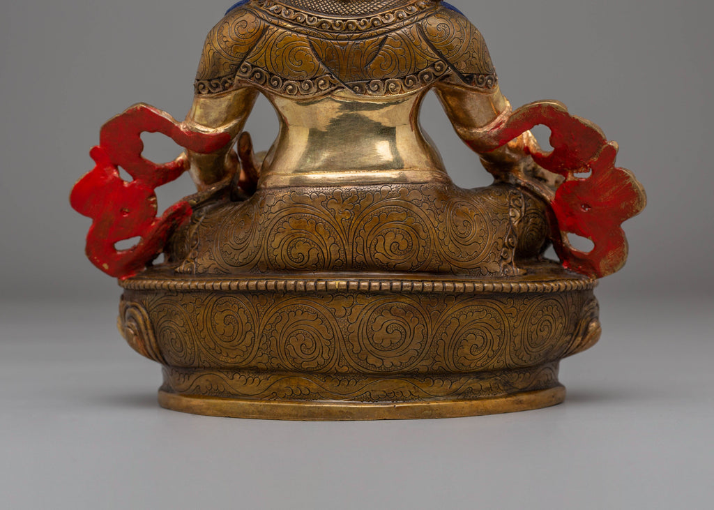 The statue depicts Dzambhala holding a jewel-releasing mongoose, a sacred symbol of shared wealth and the easing of hardship. The details on the crown, robes, and ornaments reflect skilled Himalayan craftsmanship passed down through generations. Dzambhala is closely linked with prayers for prosperity, protection, and spiritual balance.