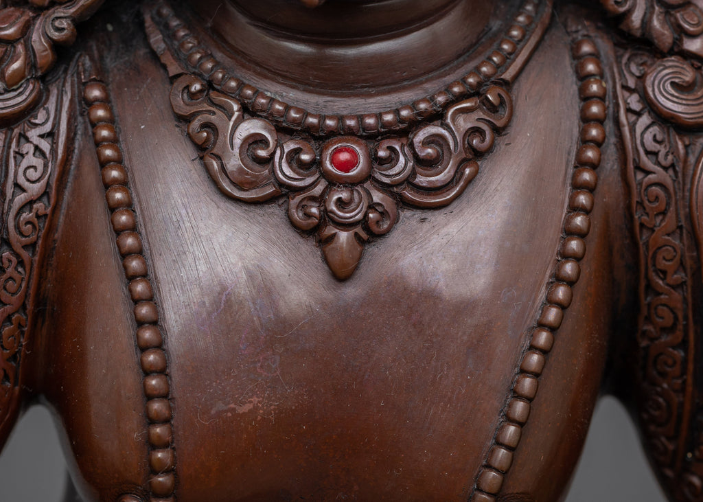 The Dzambhala Oxidized Figure Statue can help you welcome prosperity and luck. This majestic statue radiates wealth and opulence as it stands 10.8 inches tall with an 8.9-inch base. Made from high-quality oxidized copper, it exudes fine craftsmanship and minute details, perfectly capturing the spirit of wealth and prosperity. By elevating their prosperity consciousness and drawing benefits of money and abundance into their lives, devotees are inspired by the presence of Dzambhala.