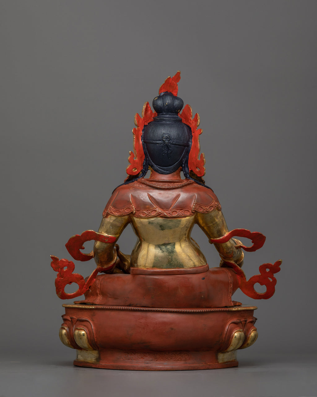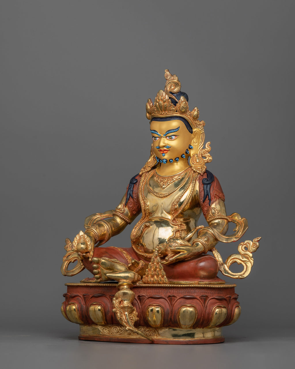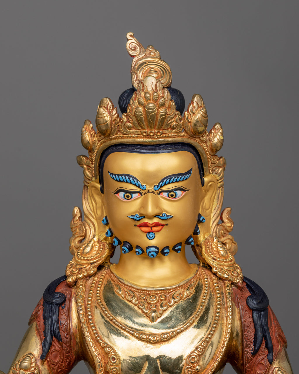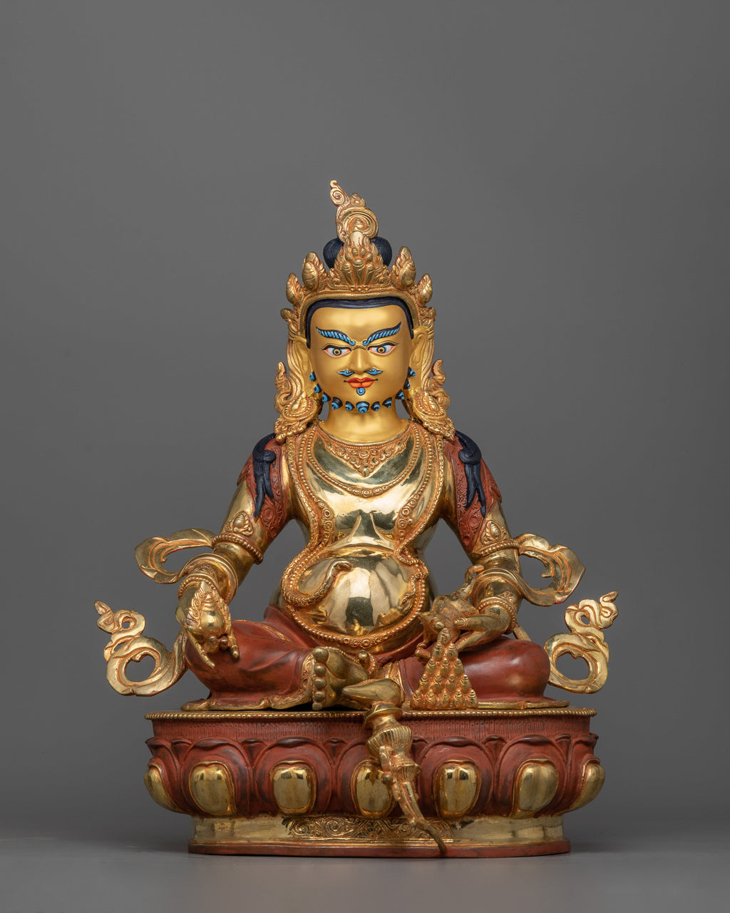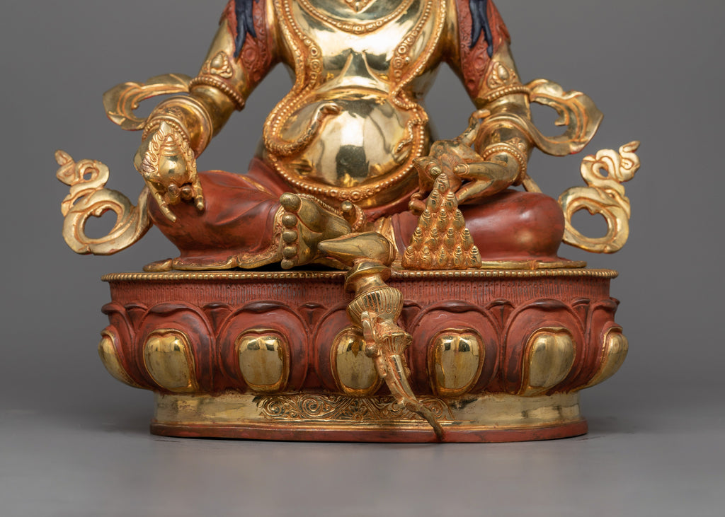 Dzambhala is shown in a sitting position, holding a mongoose in his left hand to represent the removal of material and spiritual impediments, while his right-hand rests in Granting Mudra with Citron Fruit. His crown, encrusted with magnificent gems, symbolizes the prosperity and plenty he bestows to his disciples. Dzambhala's strong yet sympathetic visage reminds practitioners of his protective nature and capacity to alleviate poverty by providing spiritual and practical gifts.