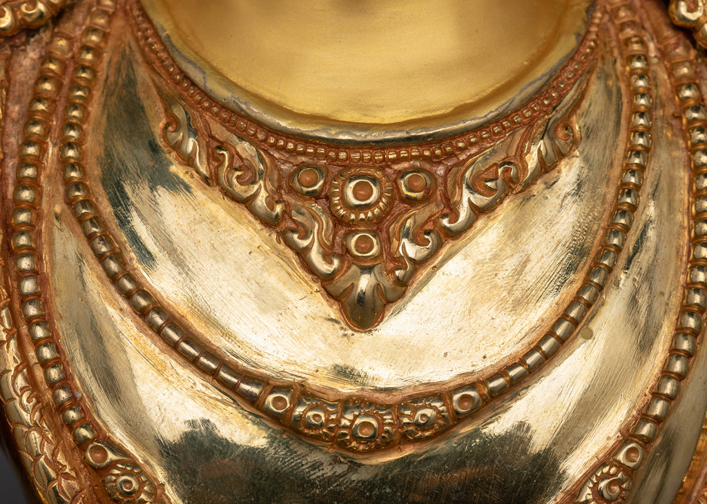 This Dzambhala Hand Carved Statue, which represents the deity of wealth and abundance, provides divine energy and spiritual assurance. This beautifully created statue measures 18.3" (Height) x 14.2" (Base) and weighs 9.30 kg. It has an oxidized copper body with brilliant 24K gold gilding and delicate gold and acrylic paintwork. Hand-carved by expert artisans, it represents the sacred creativity of Himalayan traditions, making it an effective addition to altars, meditation rooms, or spiritual collections.