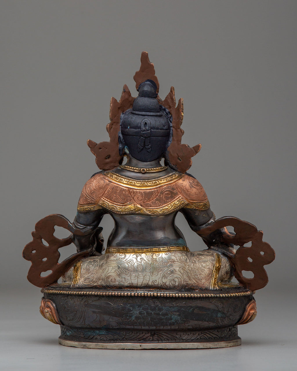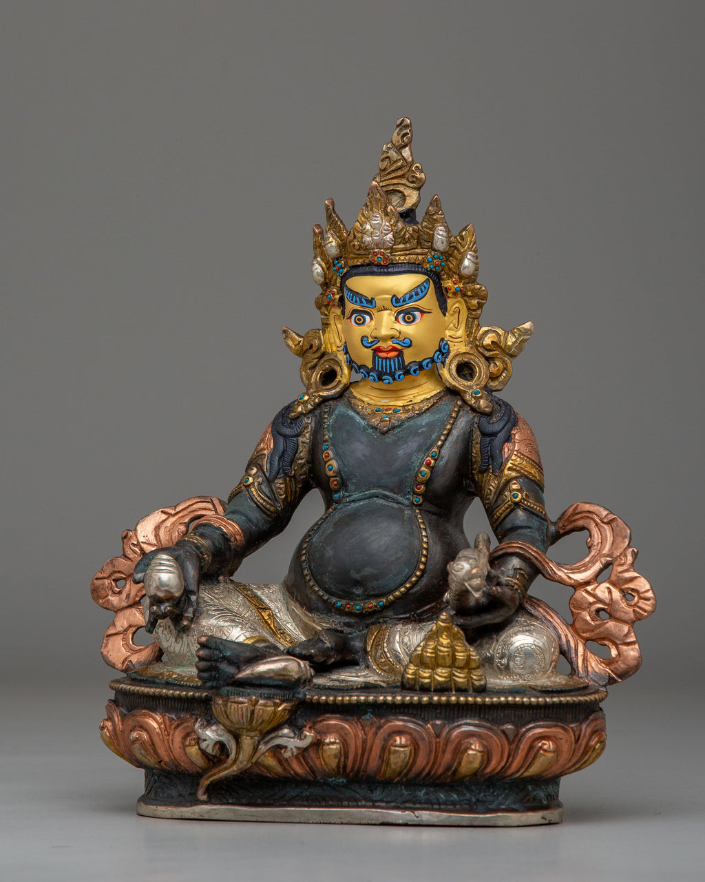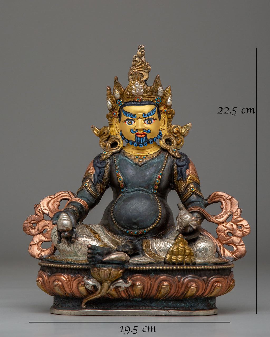 This Dzambhala statue, which is a representation of the Tibetan God of Wealth, will bring wealth and success into your home. This statue, which was carefully carved by hand from copper and then covered in gold and silver, is an example of traditional Himalayan craftsmanship. It has been embellished with gemstones and acrylic colors to highlight its features.