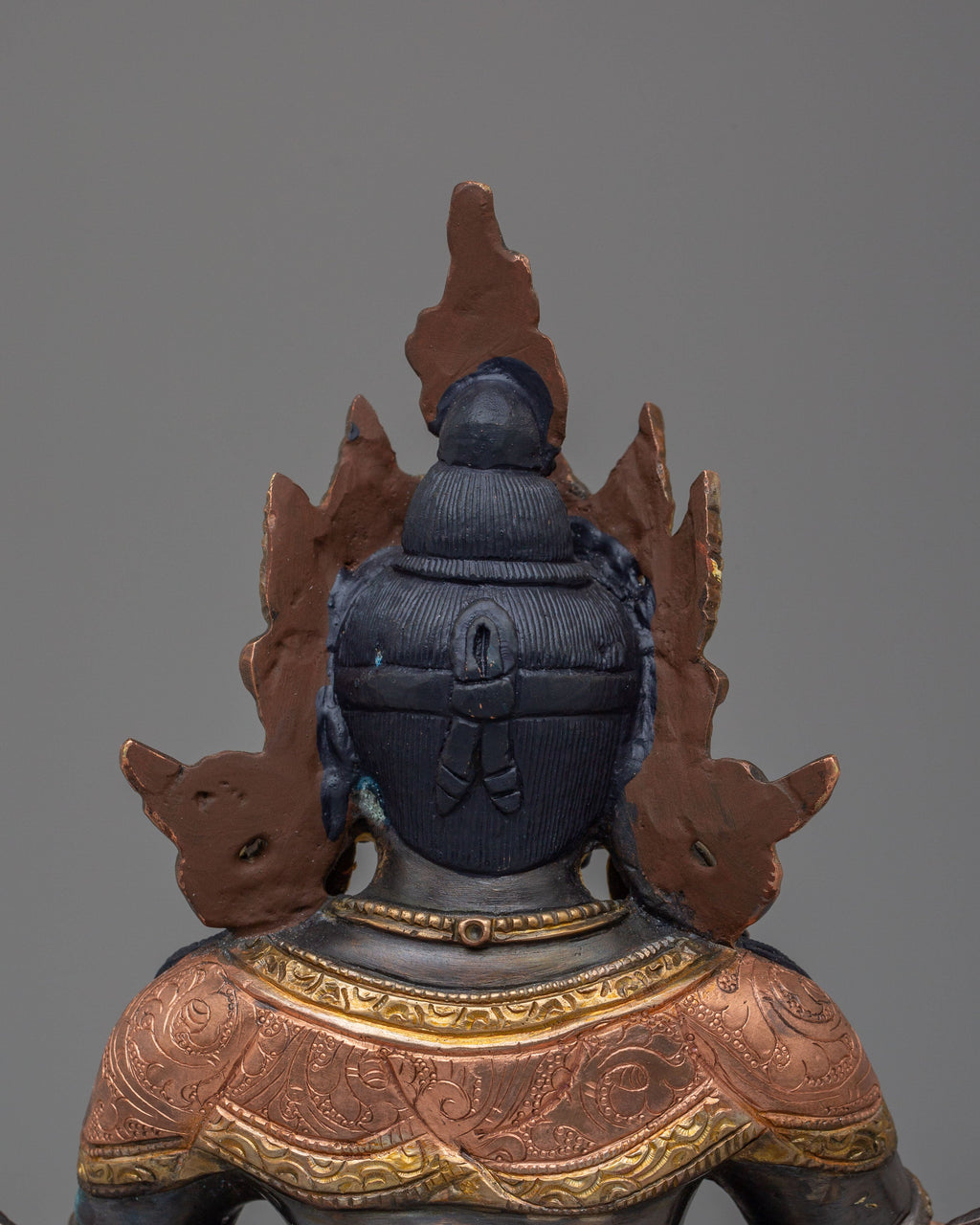 The statue is about 22.5 cm tall and 19.5 cm wide, making it ideal for display on an altar or as a centerpiece in your house. It weighs 1.58 kg, giving it a substantial and lasting presence. Dzambhala is widely revered for bringing prosperity, good fortune, and protection from misfortune. This monument serves as both a spiritual object and a decorative one, making it a valuable addition to any collection or hallowed space.