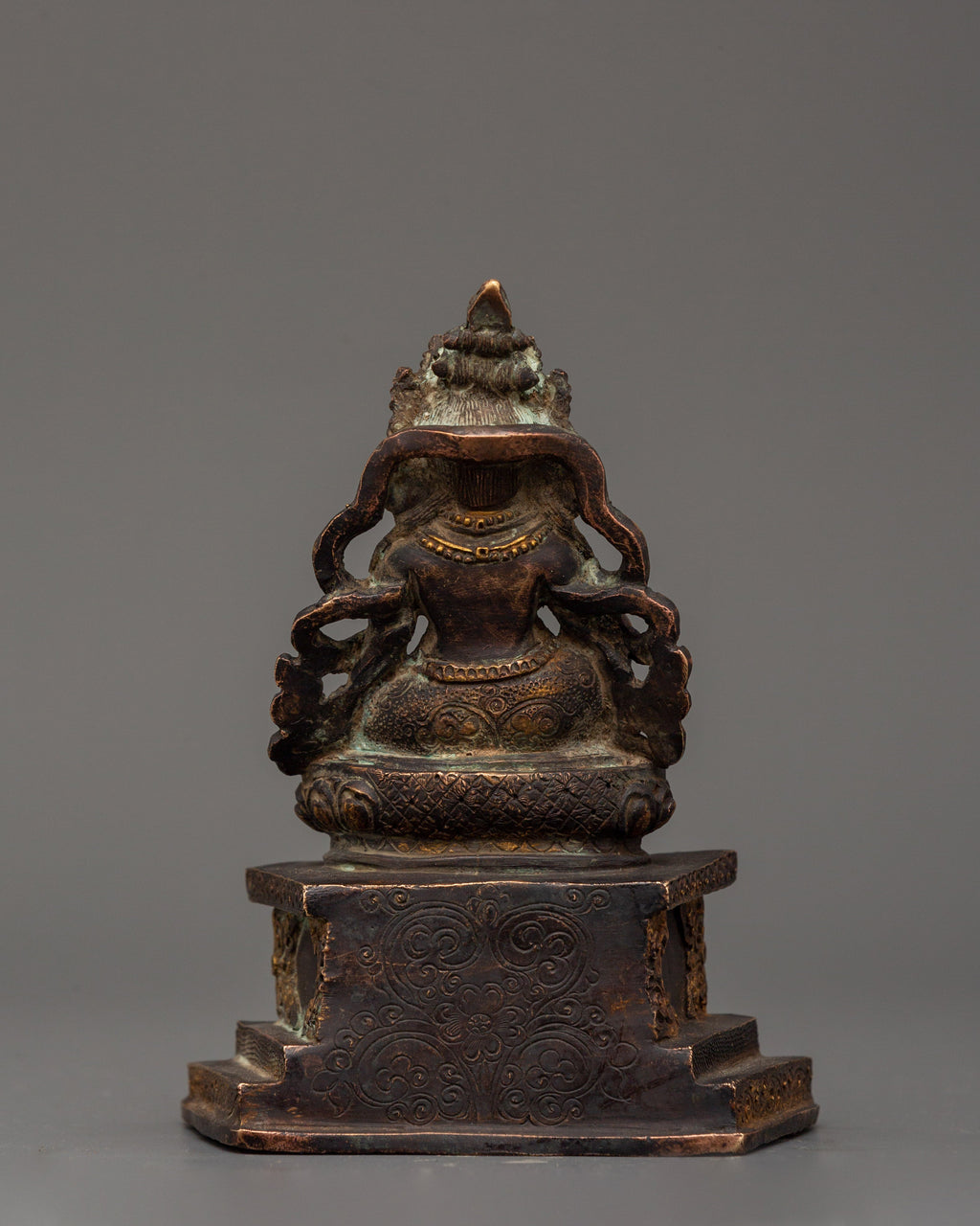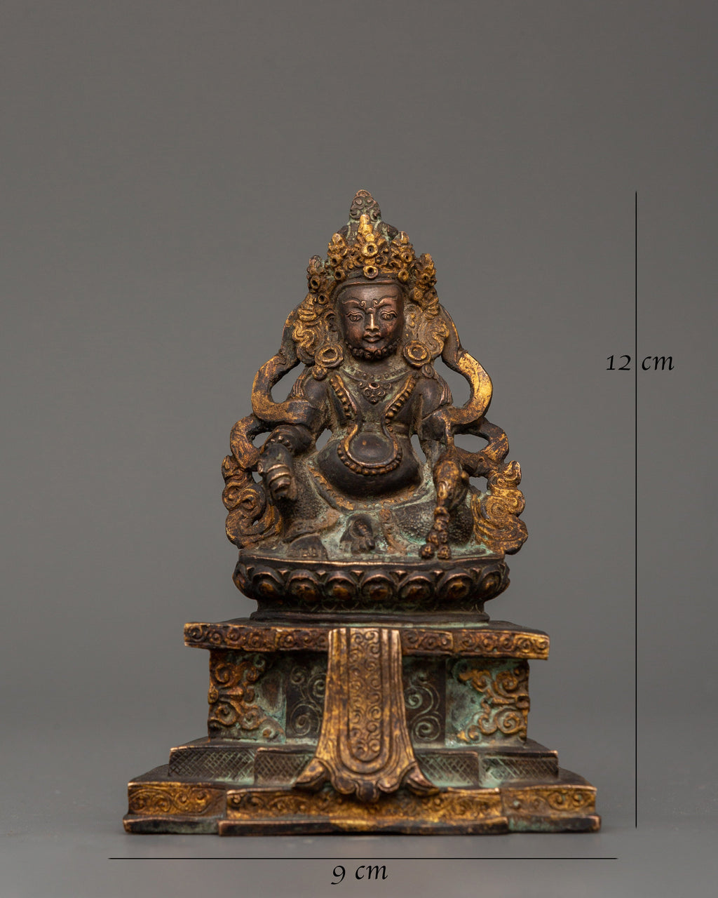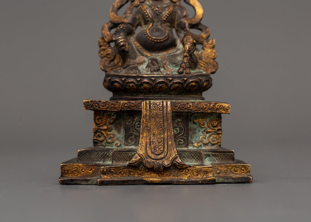 The Dzambhala Statue stands at 12 cm in height 9 cm in width, and weighs 0.42 kilograms. This magnificent copper statue, featuring a detailed antique finish, depicts Dzambhala, the Buddhist deity of riches, prosperity, and good fortune, seated upon the throne. Dzambhala is celebrated in the Buddhist tradition for his ability to grant both monetary abundance and spiritual success to his devotees, making this statue a practical addition to any religious setting.