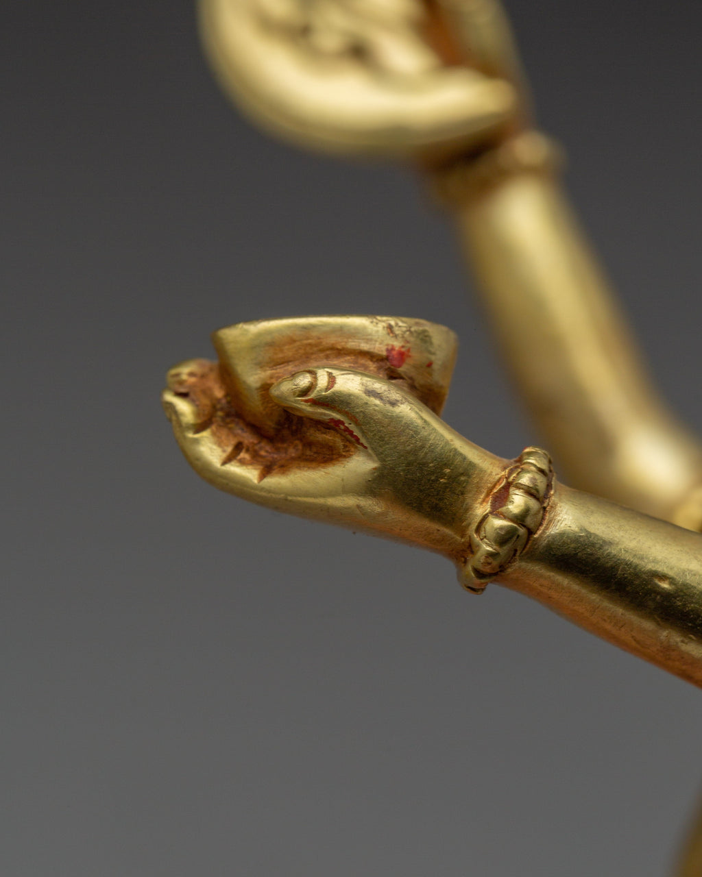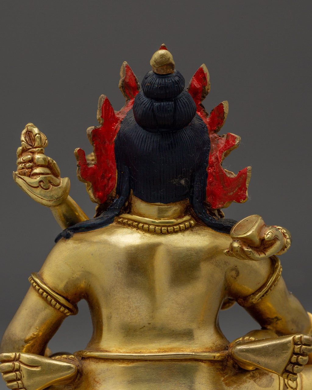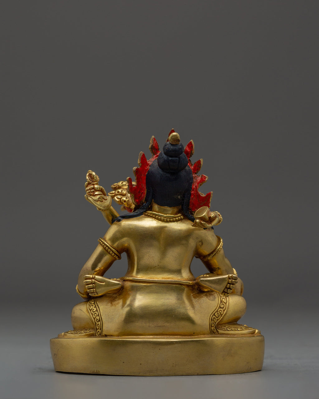 Dzambhala with consort Statue stands 5.5” (14 cm) tall with a 5.1” (13 cm) base and weighs 1.31 kg. Handcrafted from copper and adorned with 24K gold gilding, along with detailed gold and acrylic paintings, this statue represents the sacred union of Dzambhala—the Buddhist deity of wealth—and his consort. Together, they embody the perfect balance of prosperity and wisdom, symbolizing the flow of abundance through generosity and spiritual realization. Ideal for wealth rituals, tantric practice, or sacred altar display, this piece invites both material blessings and inner fulfillment.