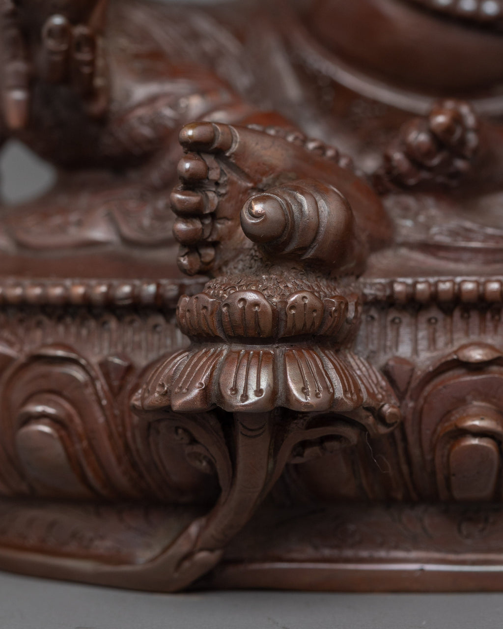 Invite abundance and spiritual prosperity with this 6.9-inch Dzambhala with an oxidized body statue, the revered deity of wealth and fortune. Crafted from oxidized copper and Beautiful gemstones, this statue is perfect for meditations. Crafted by expert Nepalese artisans, this sacred item embodies the rich traditions of Himalayan Buddhism.