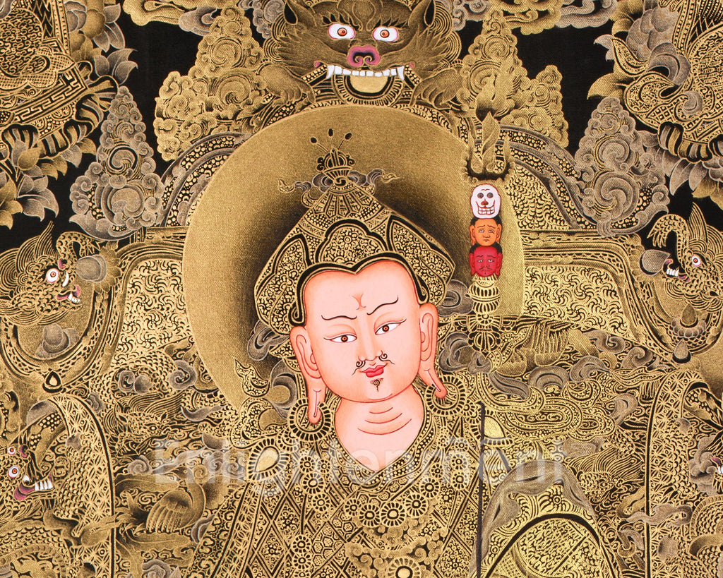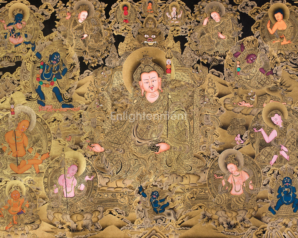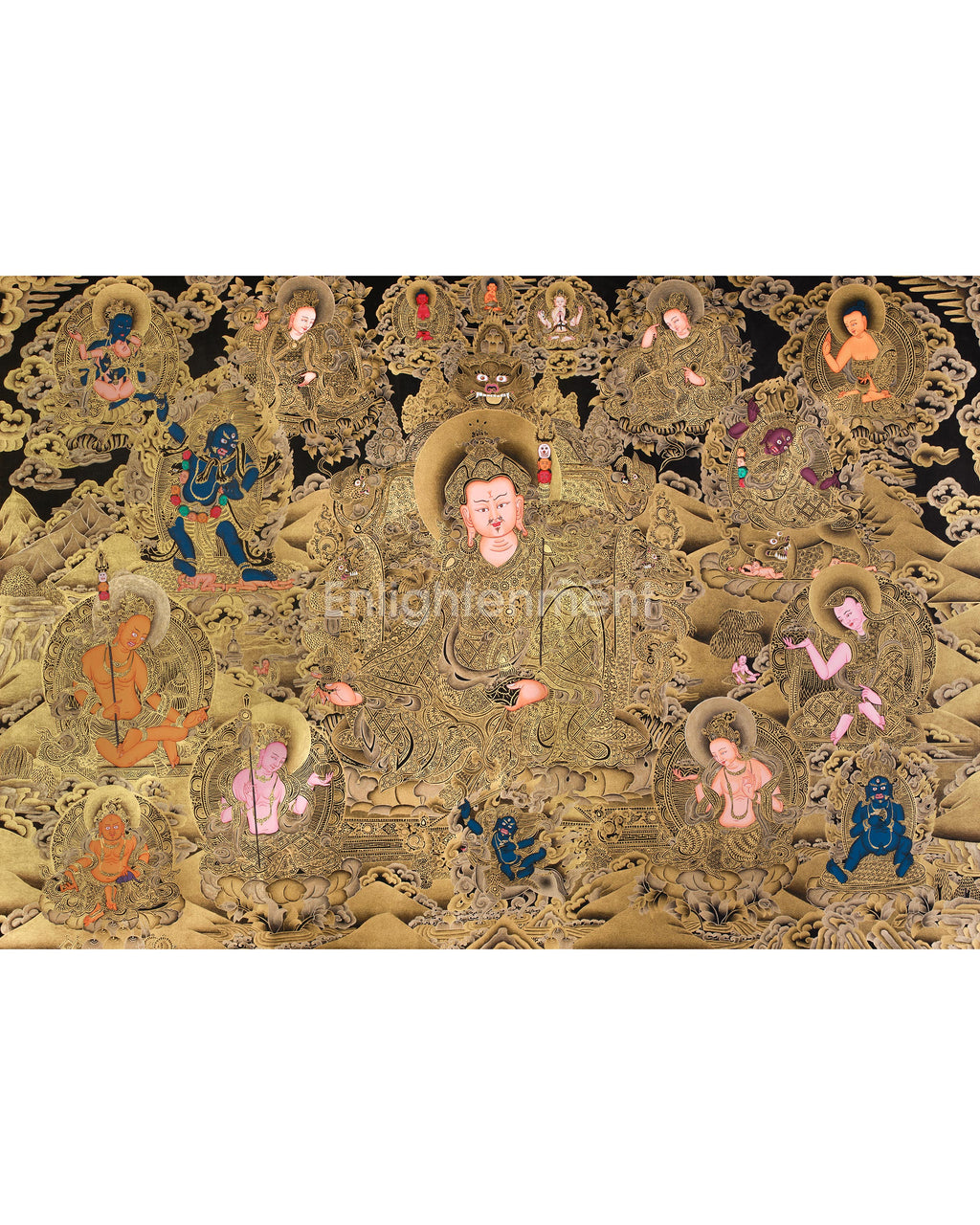 At the top of the thangka, Amitabha Buddha and other bodhisattvas are depicted, each symbolizing the multi-dimensional aspects of Guru Rinpoche’s ability to guide sentient beings along the spiritual path. These figures are positioned above to represent the wisdom, compassion, and enlightened qualities that Guru Rinpoche embodied in his various forms. The lower part of the thangka features Dzambhalas, the wealth deity that highlights the prosperity and spiritual abundance made possible by Guru Rinpoche’s blessings. These representations illustrate how Guru Rinpoche’s spiritual power generates material wealth and illuminates the path to spiritual richness and abundance, uniting both realms of existence in his enlightened presence.