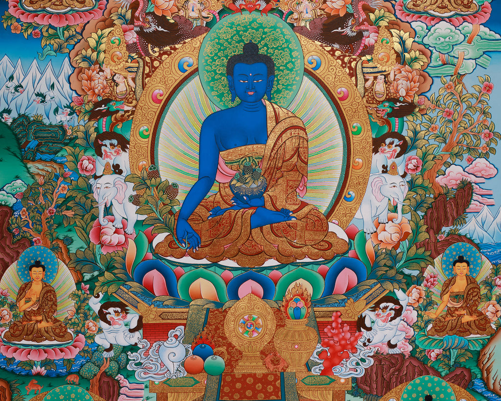 This Eight Medicine Buddhas thangka is a large and intricate work of sacred art, hand-painted by our skilled team of artists in the Kathmandu Valley. It is created using traditional Tibetan techniques on premium cotton canvas, which has been carefully prepared with pure substances to ensure a smooth and durable foundation.