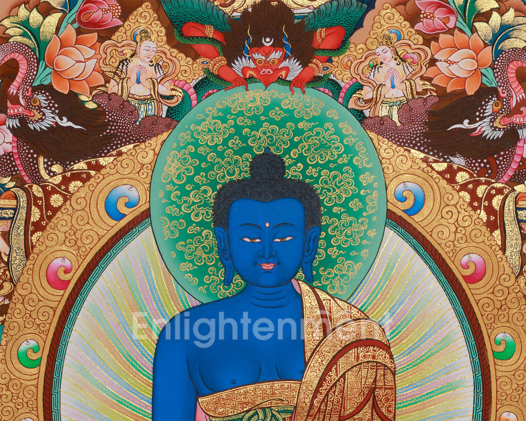 The central figure of the thangka is Bhaisajyaguru, also known as the Medicine Buddha. He is depicted in a deep lapis-blue hue that represents spiritual clarity, healing power, and the depth of compassion. He is seated in vajra posture on a multicolored lotus throne resting on a moon disc. In his left hand, he holds a bowl of healing nectar filled with myrobalan fruit, a potent herbal medicine in both Ayurveda and Tibetan medicine. His right hand rests on his knee in the gesture of granting medicine, holding a stem of the healing plant. His expression is calm and focused, reflecting his vow to cure the suffering of body and mind.