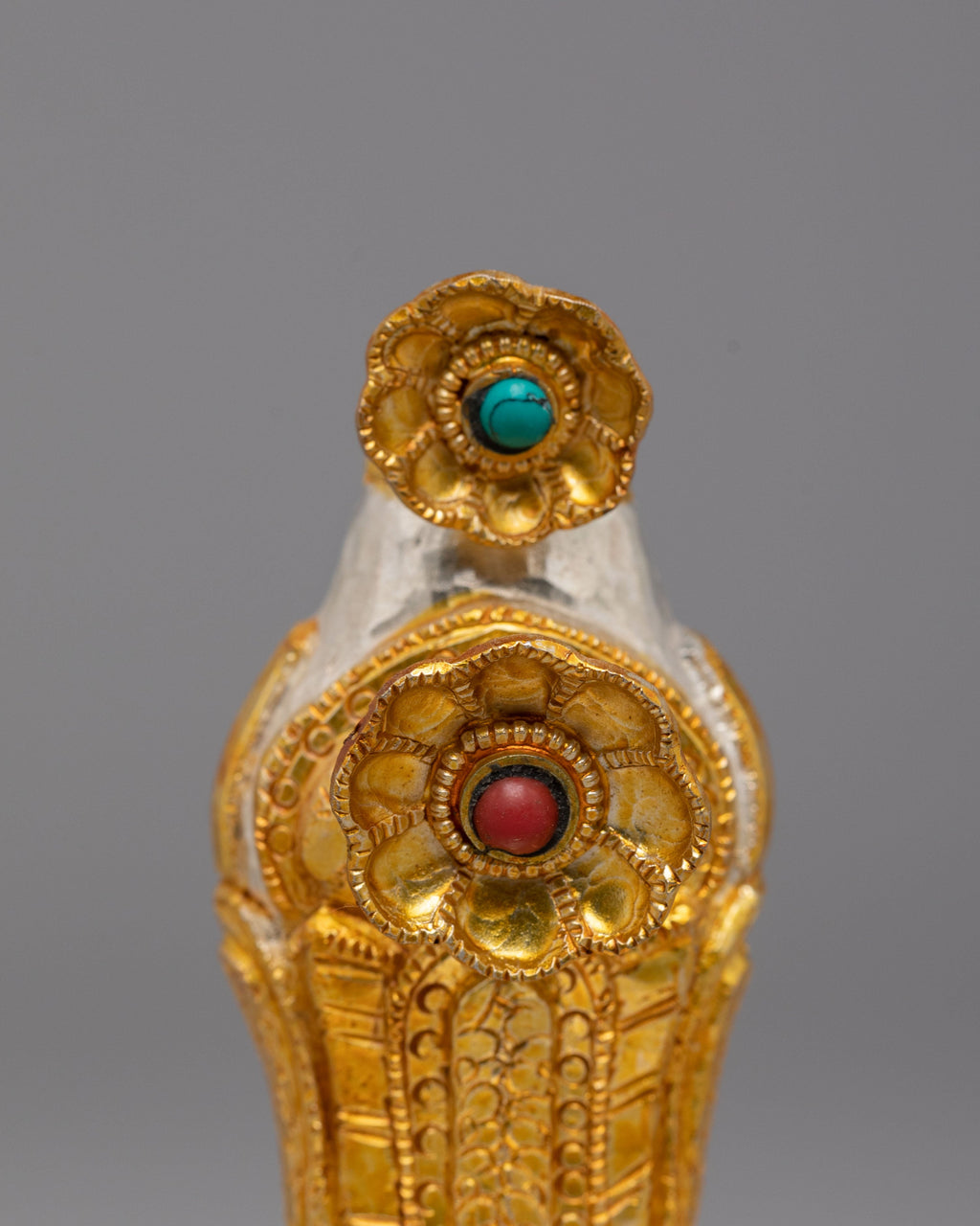 The Handmade Spiritual Torma has a focal pattern that historically represents an offering of food or wisdom to the deities. The design features intricate carvings enhanced by electro-gold and electro-silver plating, giving the item depth and brilliance. The coral and turquoise stones included throughout the pattern represent energy, protection, and spiritual clarity. These rare stones, along with superb craftsmanship, raise the torma to the status of both a work of art and a sacred tool for meditation and ritual sacrifices, in keeping with Tibetan Buddhist traditions.