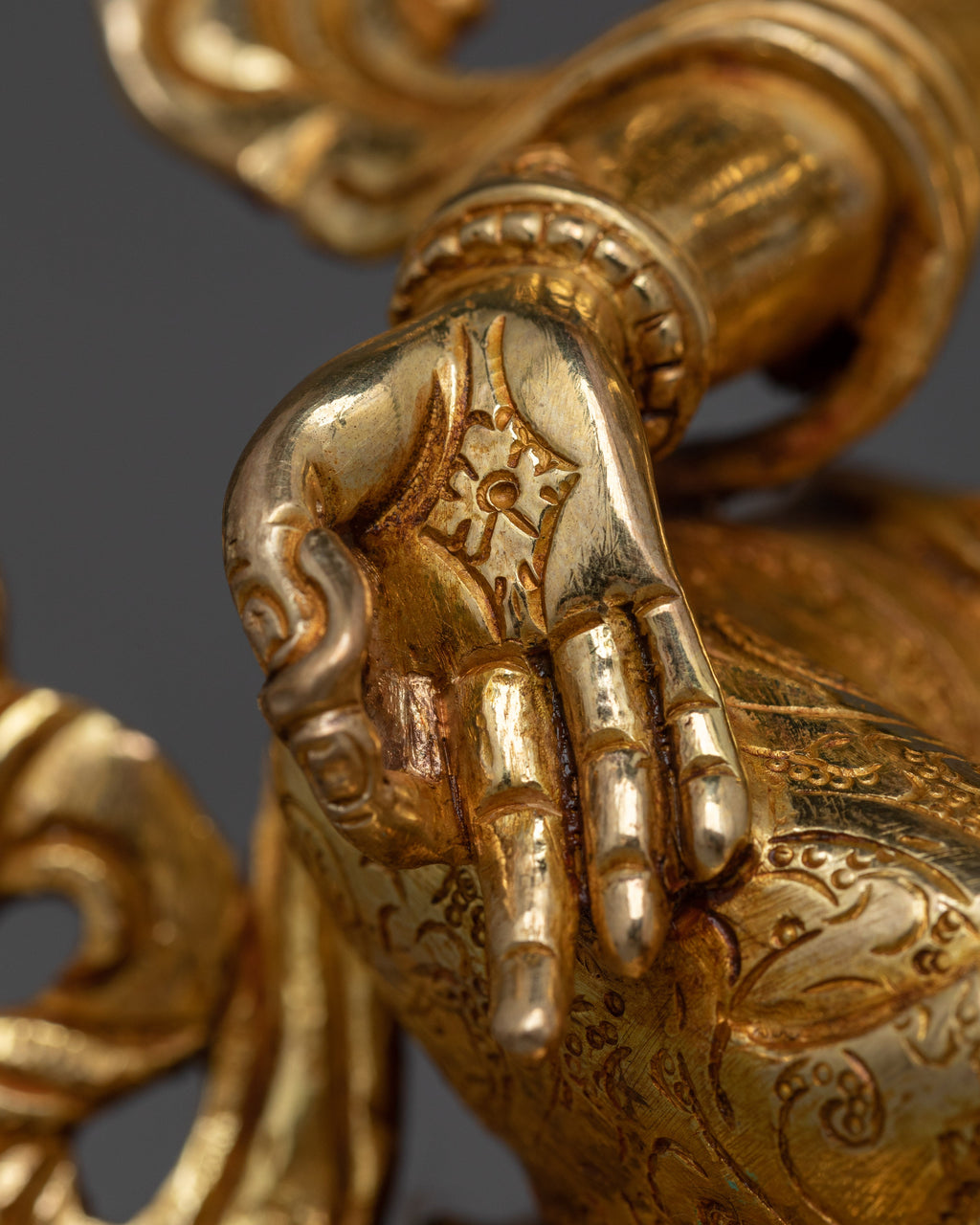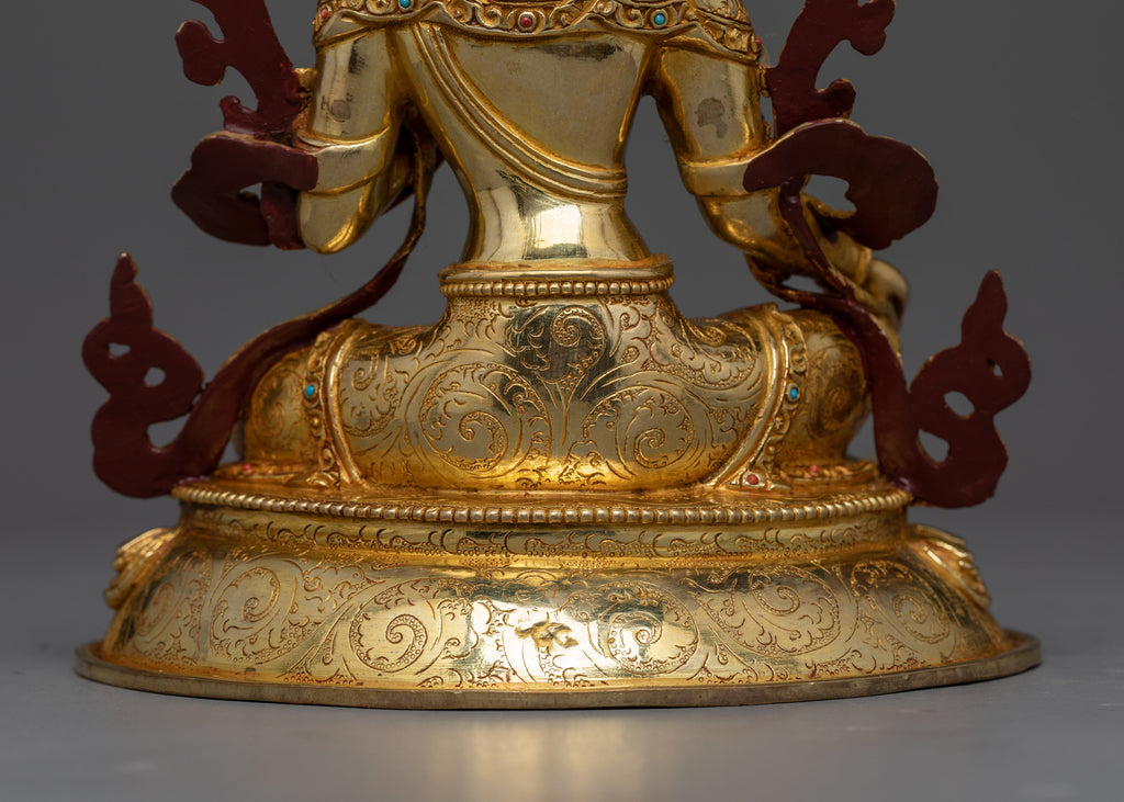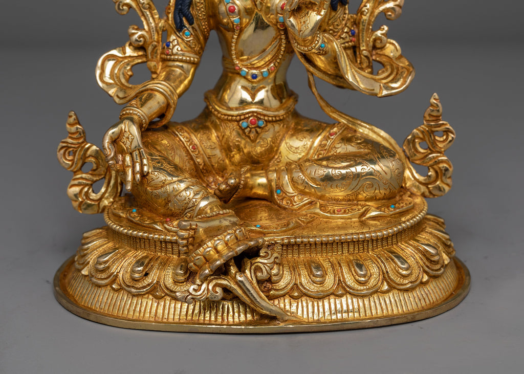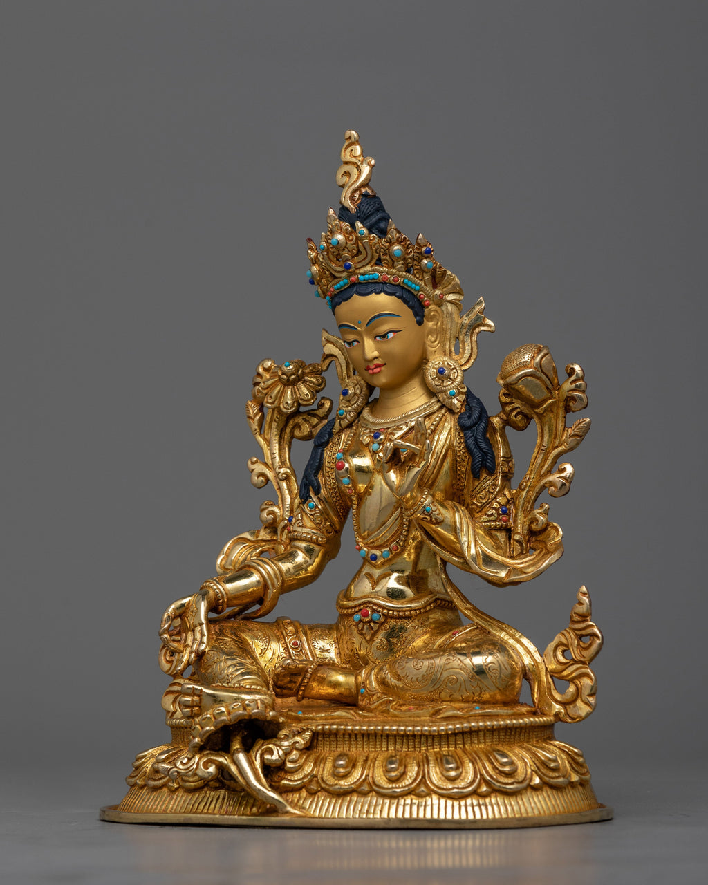 This statue, made of fine copper and gilded in 24K gold, exudes divine presence. It exudes devotion and grace as it is embellished with gold and acrylic paints and gemstones. Weighing 1.92 kg, Green Tara's tranquil expression and beautiful patterns make it an ideal complement to any meditation place or shrine.