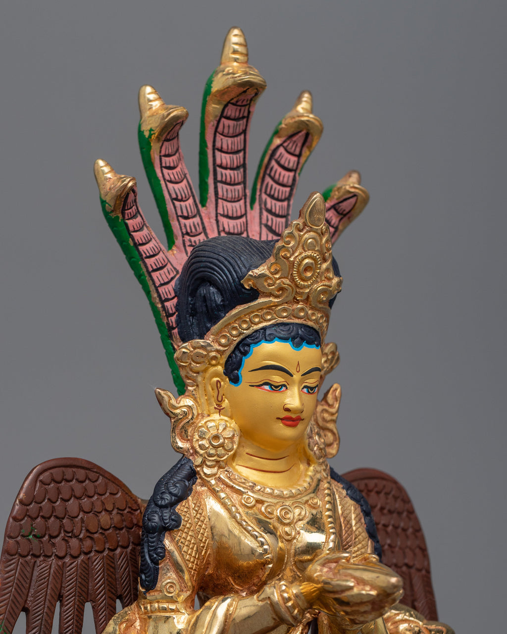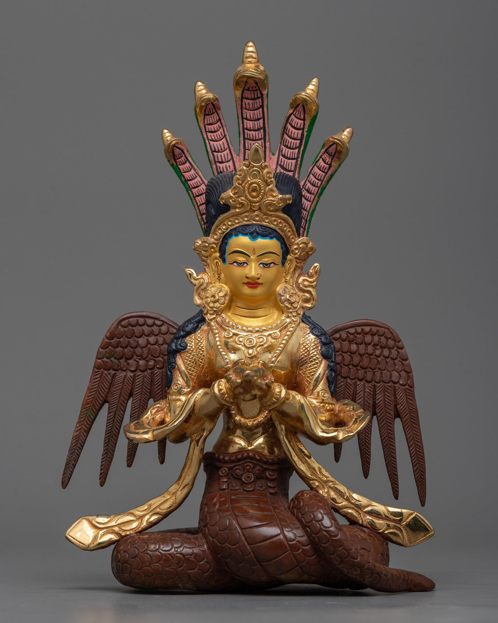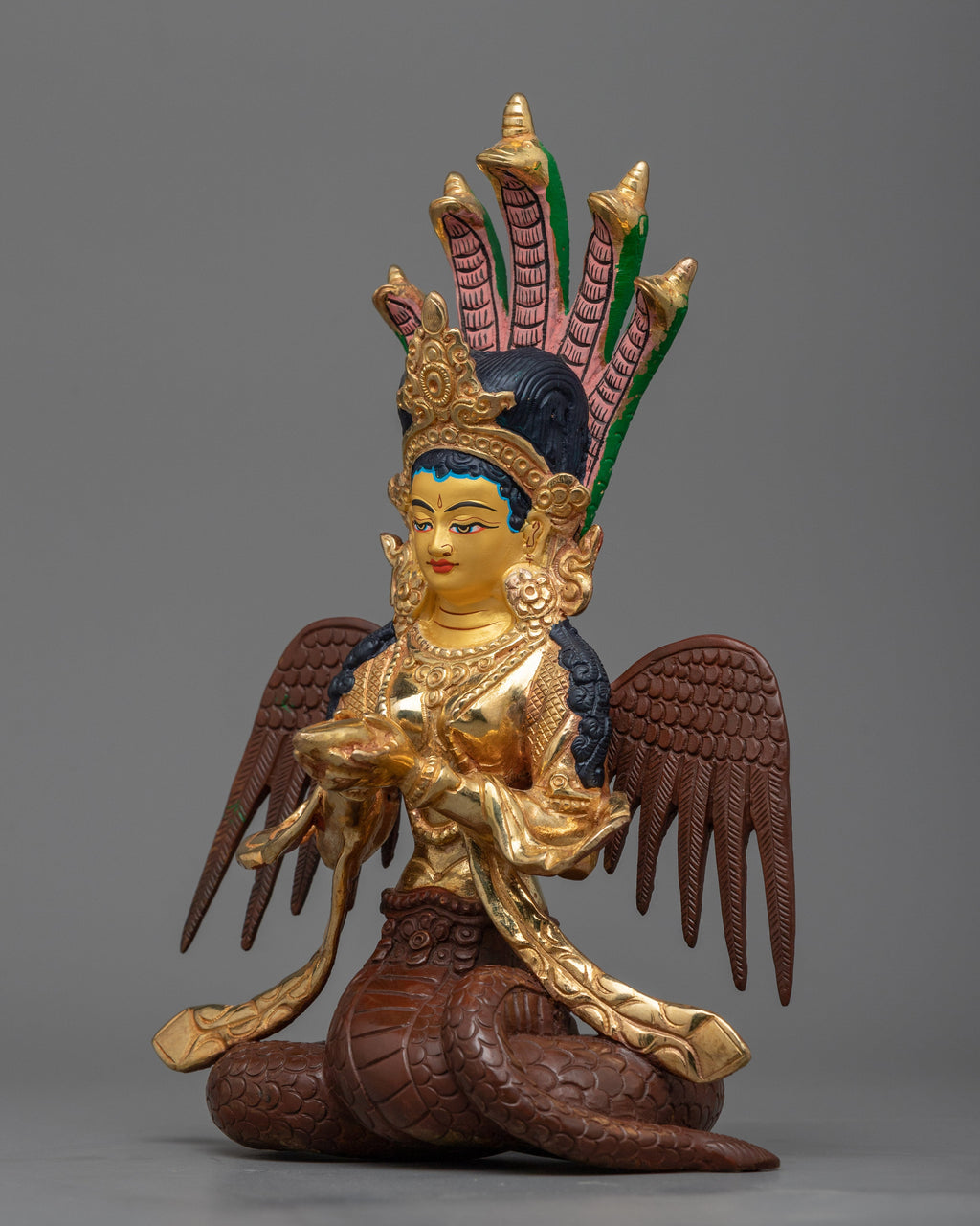 This sculpture's exquisite 24K gold gilding, which highlights its divine presence and the minute details that perfectly represent Nag Kanya's calm yet commanding character, is applied to its oxidized copper body. The sculpture is given colorful life by the gold and acrylic paintings, which emphasize the deity's majestic features and the deep symbolism connected to her form with every brushstroke.