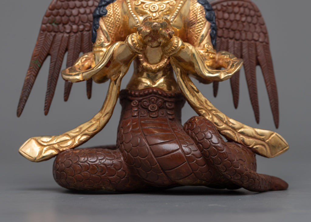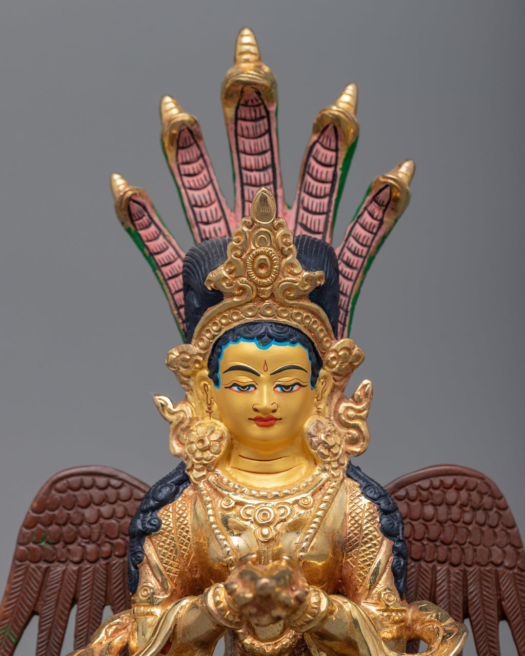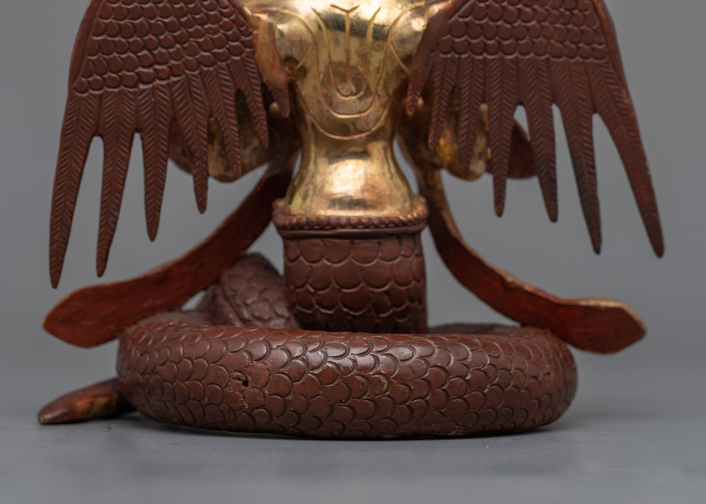 This sculpture's exquisite 24K gold gilding, which highlights its divine presence and the minute details that perfectly represent Nag Kanya's calm yet commanding character, is applied to its oxidized copper body. The sculpture is given colorful life by the gold and acrylic paintings, which emphasize the deity's majestic features and the deep symbolism connected to her form with every brushstroke.