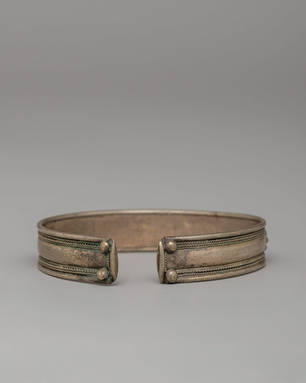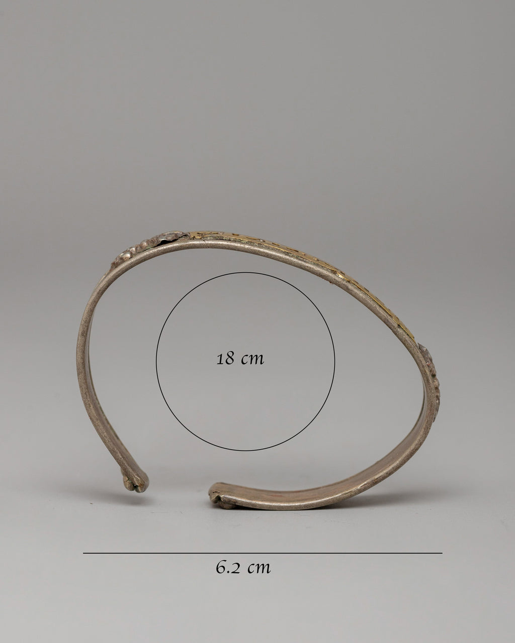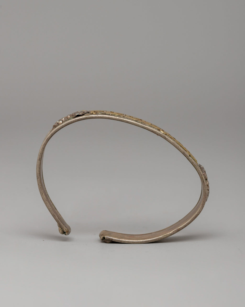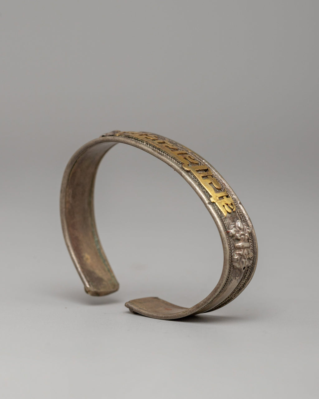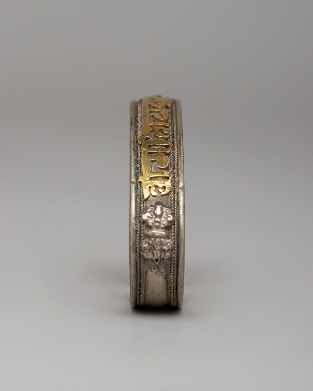 This handcrafted engraved cuff bracelet is a fusion of art and faith, fashioned with care from white metal. The carved mantra is delicately embossed with gold-tone writing, representing compassion, knowledge, and serenity. This lightweight (18g) bracelet is 1.2 cm in height, 6.2 cm in width, and has an 18 cm circumference, making it a good fit for most wrist sizes.