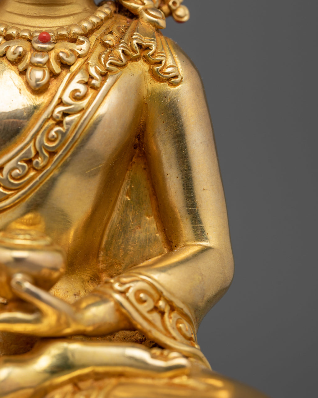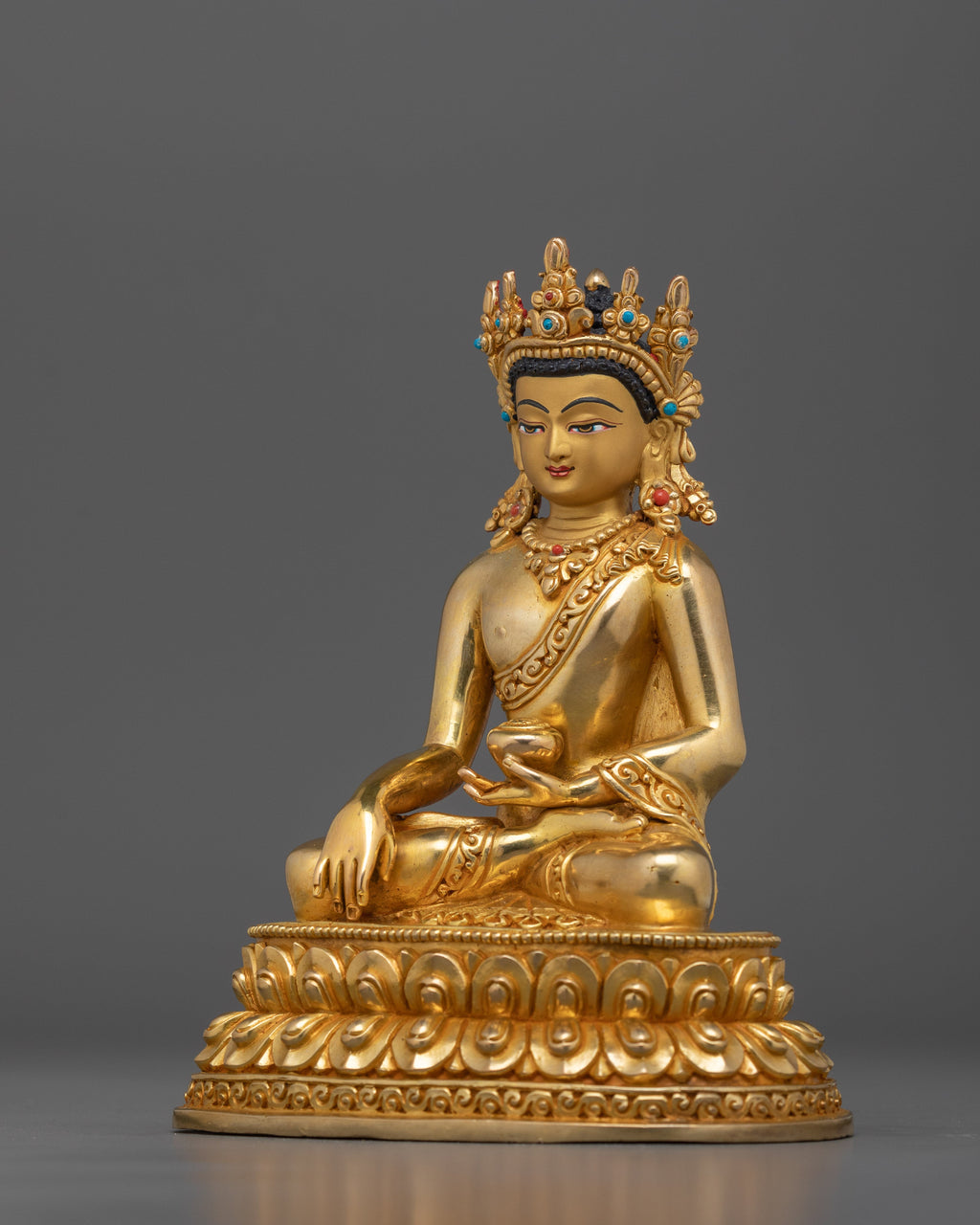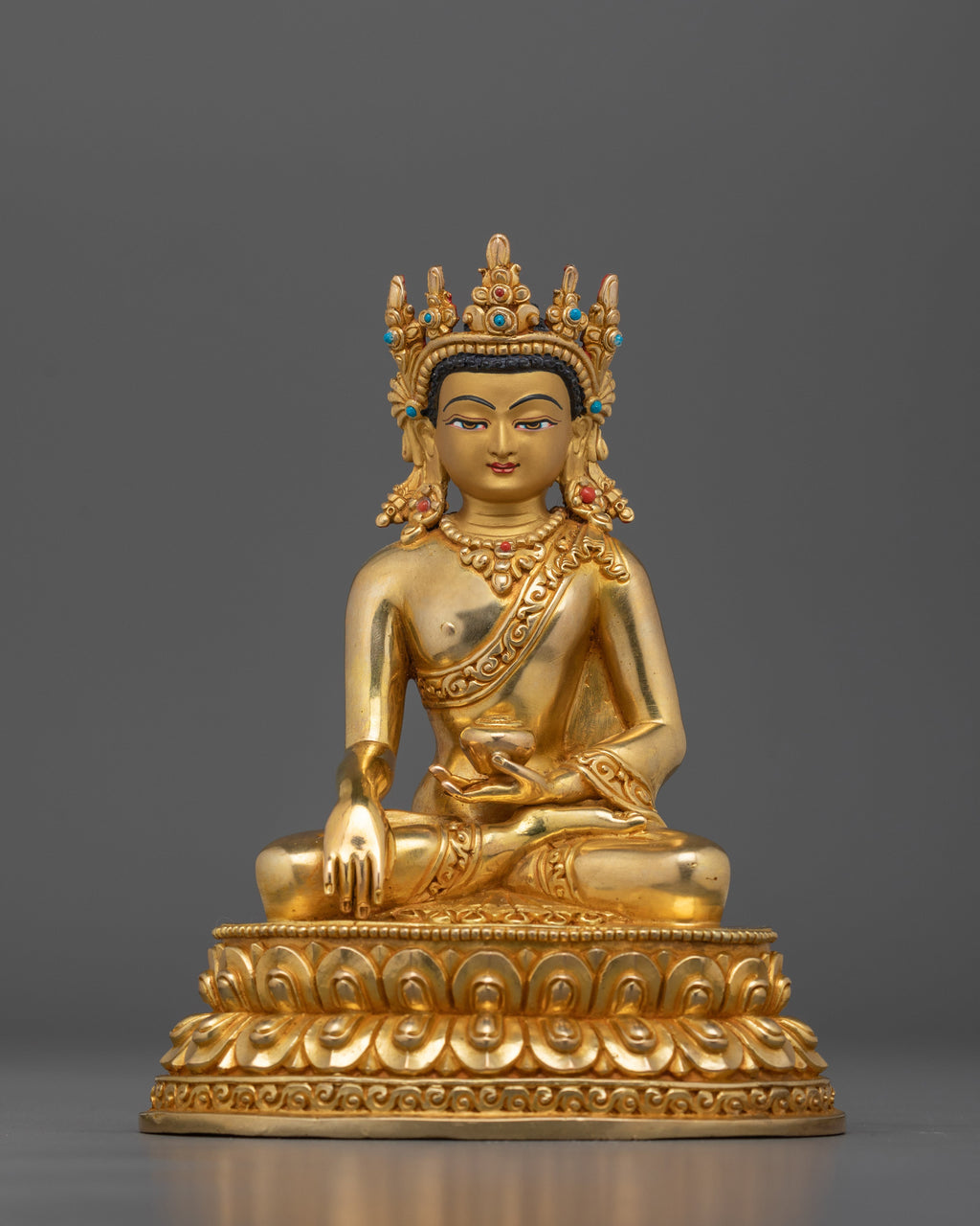 Crafted by hand in Nepal, this depiction of Buddha Shakyamuni features a copper body gilded in 24K gold. The details are highlighted by the tasteful combination of acrylic and gold paintings, which heightens the piece's creative brilliance and spiritual aura.