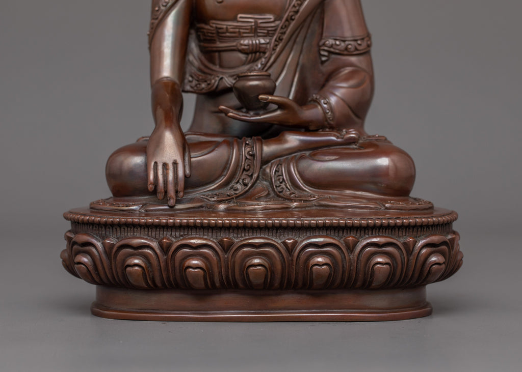 The Enlightened Buddha Shakyamuni Statue for Meditation symbolizes the Buddha's deep teachings and the path to spiritual awakening. This handcrafted statue is 8.7" (Height) x 6.1" (Base) and weighs 1.77 kg. It is made of oxidized copper. This sacred statue, created by expert Nepalese artisans, represents the craftsmanship of Himalayan Buddhism, making it an inspirational addition to altars, meditation places, or sacred collections.