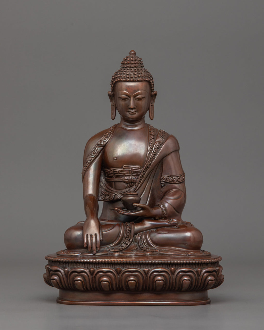 Shakyamuni Buddha is depicted sitting in the lotus pose (padmasana), indicating his steady concentration and mastery over the distractions of the material world. His right hand stretched toward the earth in bhumisparsha mudra, represents his moment of enlightenment, inviting the earth to witness his waking. The left hand, lying gently in his lap in dhyana mudra holding an alms bowl depicts the profound state of meditation and mindfulness that leads to insight and clarity.