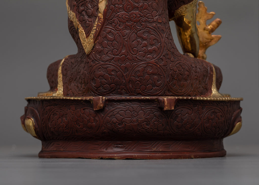 Medicine Buddha deity sits serenely on a lotus disc, holding a myrobalan plant with her right hand lightly touching the ground and an alms bowl in her left hand. The craftsmen have carved stunning design patterns, creating a flawless finish.