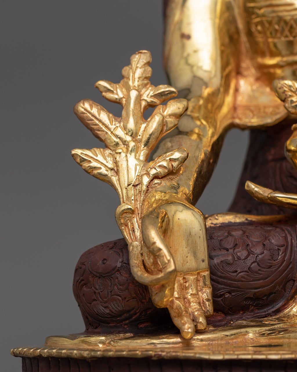 This Enlightened Buddhist Deity Bhaisajyaguru Sculpture, Medicine Buddha statue, stands at a height of 14.4 inches (36.5 cm) with a base width of 10.6 inches (27 cm) crafted, the statue is adorned with 24K gold gilding, enhanced by intricate gold and acrylic paintings that highlight its divine features. Made with copper body, this statue embodies the serene and compassionate energy of the Medicine Buddha, revered as the Buddha of Healing.