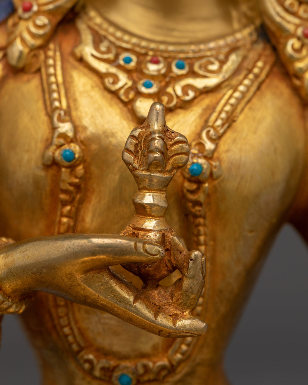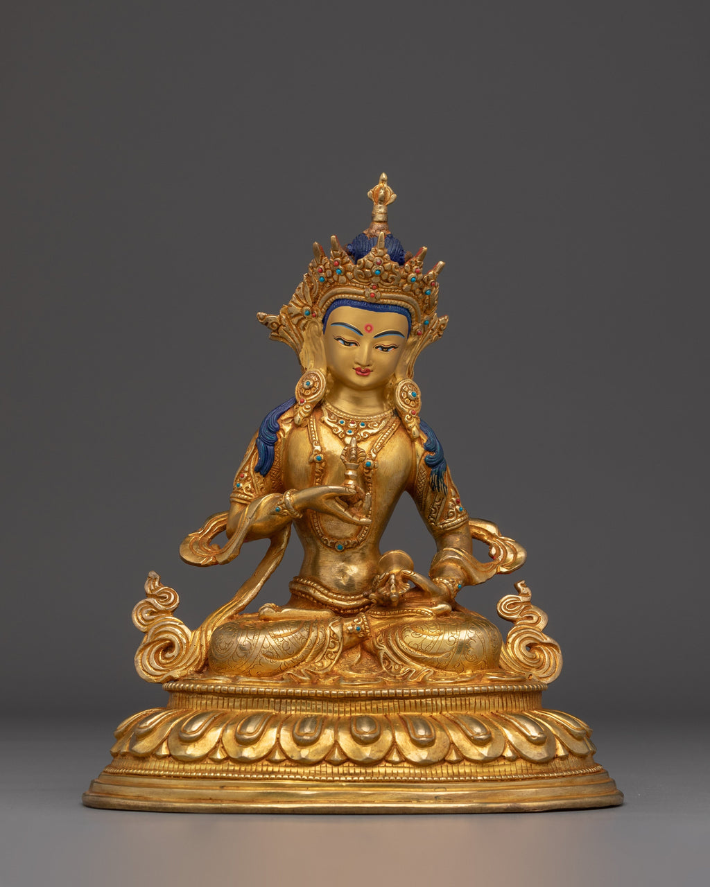 Enlightened Deity Vajrasattva is crafted from copper, adorned with 24K gold gilding, intricate gold and acrylic paintings, and inlaid gemstones. Measuring 9.8”/25cm in height and 8.5”/21.5cm at the base, it weighs 1.98 kg. Vajrasattva, the embodiment of purification in Vajrayana Buddhism, is a powerful support for meditation, spiritual cleansing, and inner renewal, making it an ideal addition to altars or sacred spaces.
