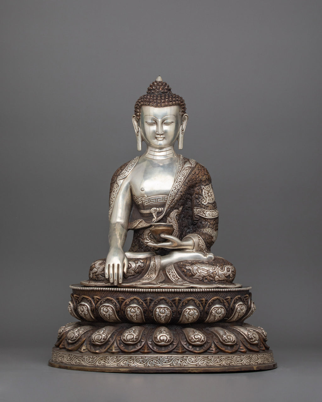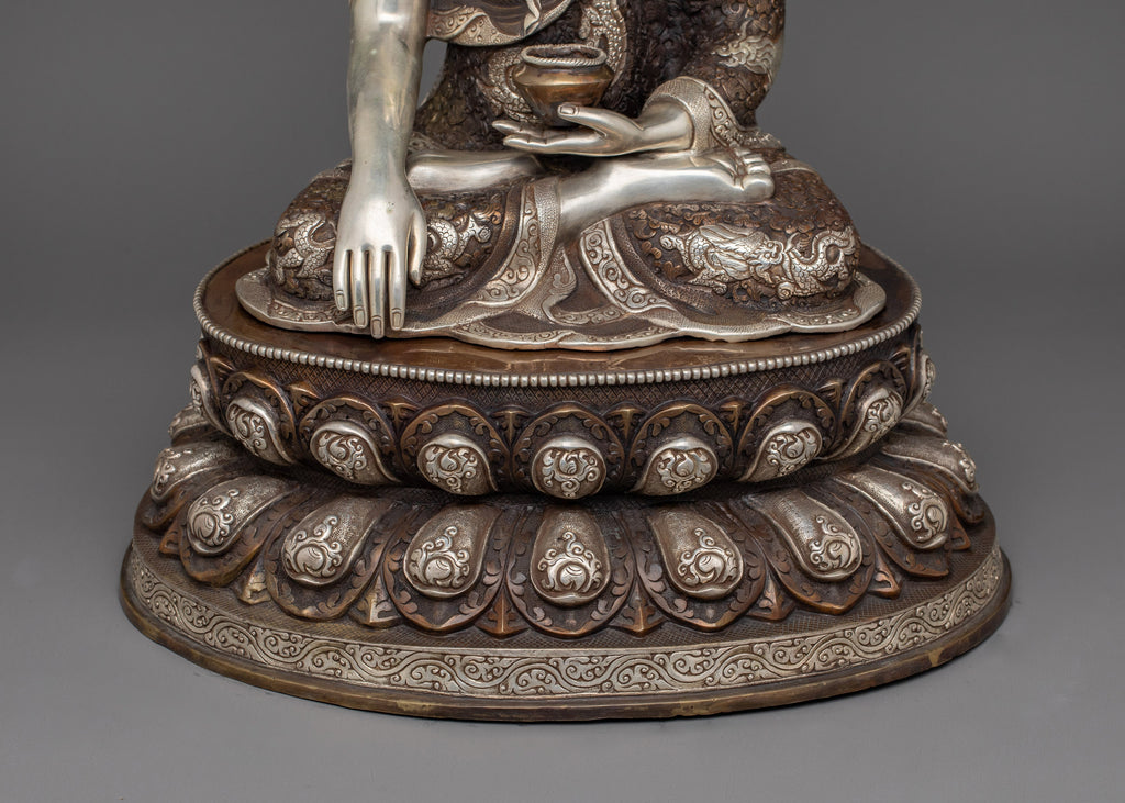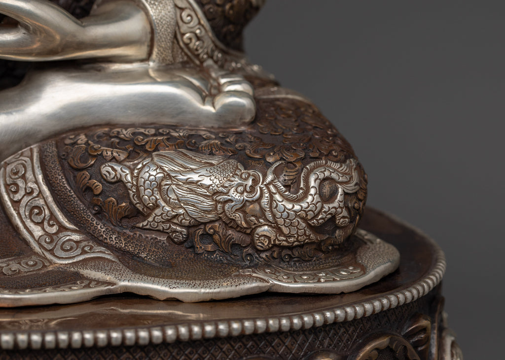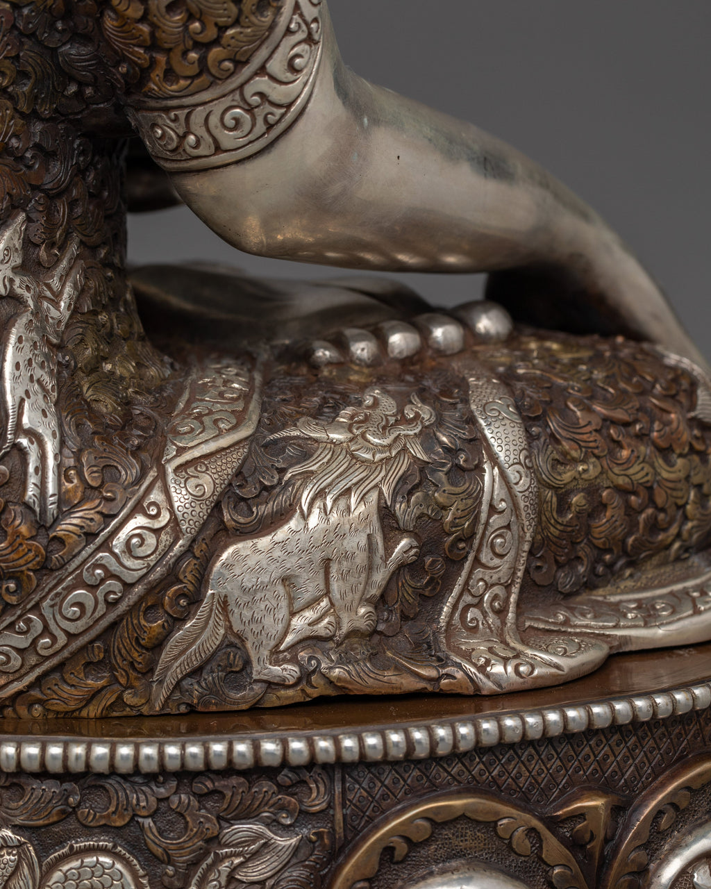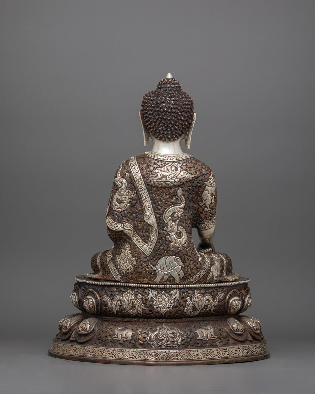 The Enlightened Dharma Teacher Shakyamuni Buddha Statue symbolizes the Buddha's deep teachings and the path to spiritual awakening. This handcrafted statue is 17.7" (Height) x 14.2" (Base) and weighs 8.05 kg. It is made of oxidized copper, enhanced with silver plating. This sacred statue, created by expert Nepalese artisans, represents the craftsmanship of Himalayan Buddhism, making it an inspirational addition to altars, meditation places, or sacred collections.
