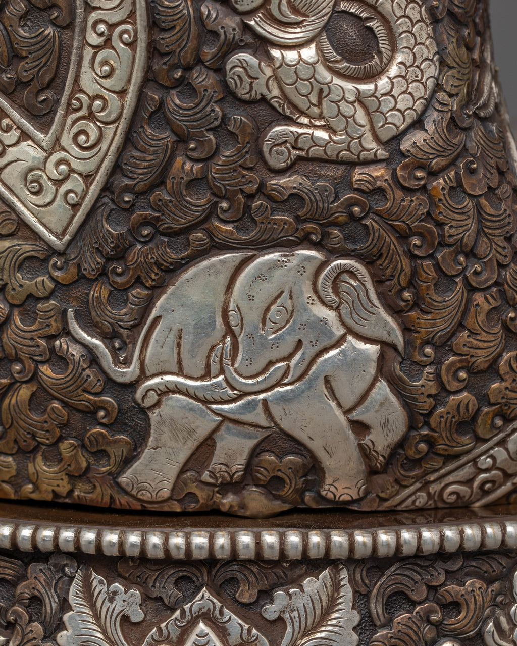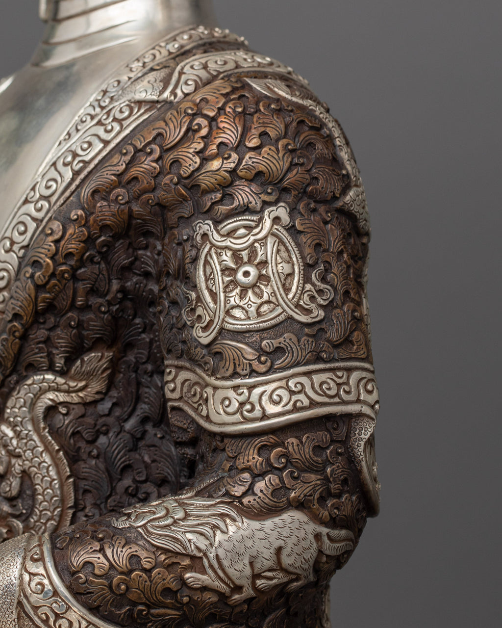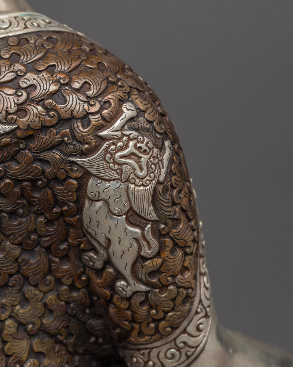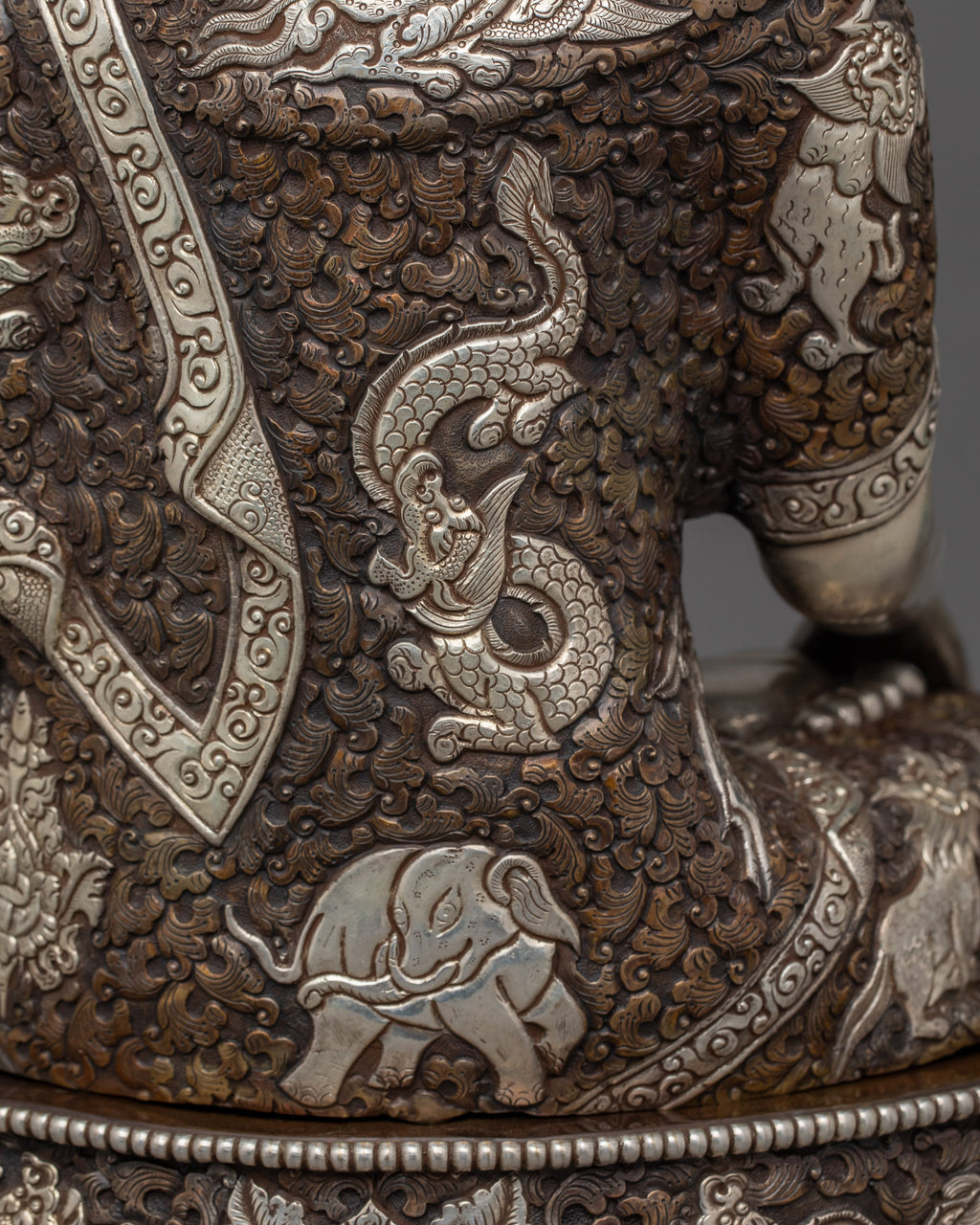 The Enlightened Dharma Teacher Shakyamuni Buddha Statue symbolizes the Buddha's deep teachings and the path to spiritual awakening. This handcrafted statue is 17.7" (Height) x 14.2" (Base) and weighs 8.05 kg. It is made of oxidized copper, enhanced with silver plating. This sacred statue, created by expert Nepalese artisans, represents the craftsmanship of Himalayan Buddhism, making it an inspirational addition to altars, meditation places, or sacred collections.