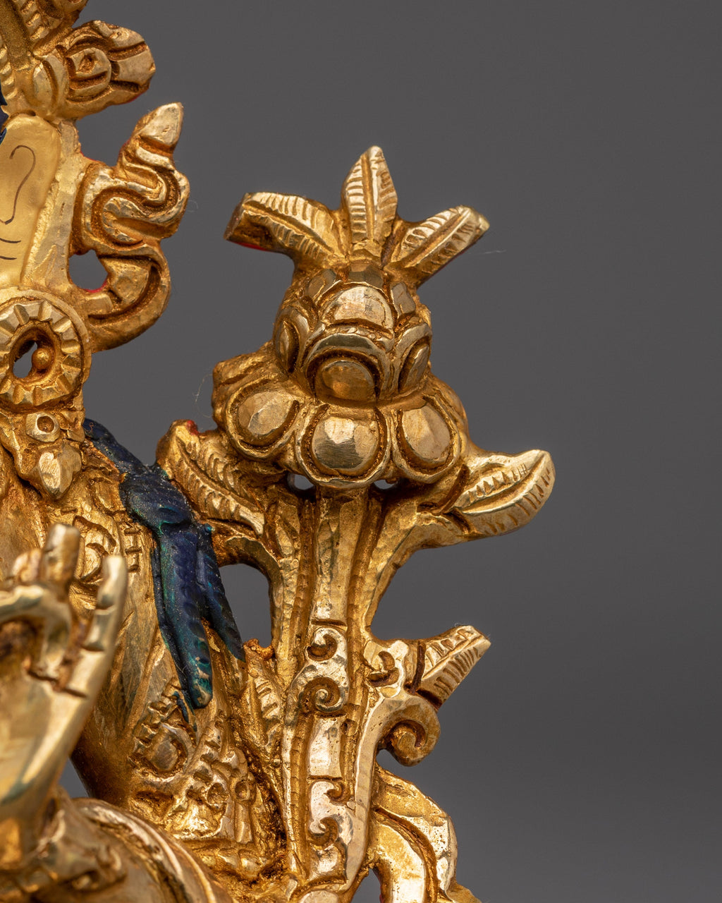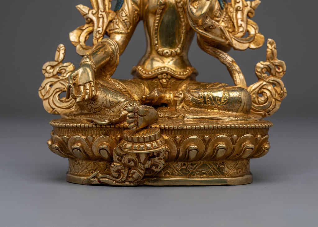 As depicted, Green Tara is shown seated on a lotus throne with her right leg typically extended forward, signifying her active compassion and willingness to help. Her hands express profound meaning through their gestures, the right hand is displayed in the "gesture of giving" (Varada Mudra), symbolizing her boundless generosity and willingness to provide blessings. Meanwhile, her left hand delicately holds a blue lotus (Utpala), a symbol of purity and spiritual awakening, offering protection and reassurance to those who seek her guidance.